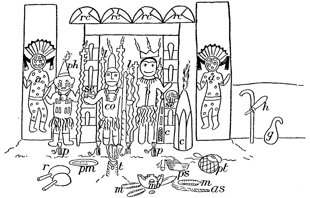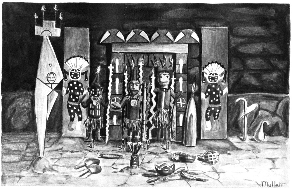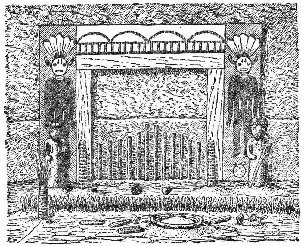 Two idols, probably of wood, stand between the vertical slats of the altar, filling nearly the whole space. That on the left evidently represents the Sky God (Cotokinungwu) for it has a conical apex to the head, a painted chin, and near its left hand stands a wooden slat of zigzag form, a prescribed symbol of lightning.[3] This image has several short parallel marks of different colors on the body, and wears horsehair, stained red, about the loins.