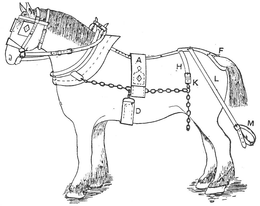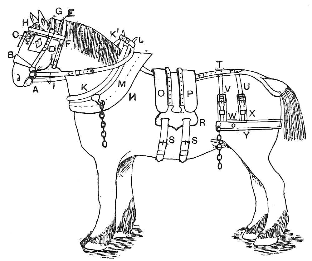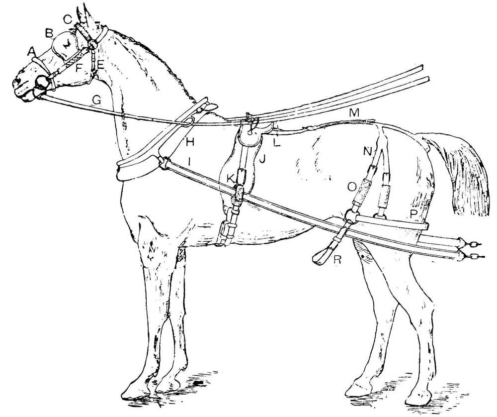 Hansom cab harness is not much different, though the saddle (Fig. 194) is lighter, and some have rollers inside the saddle so that the back-band may run smoothly backwards and forwards through the tree; these trees are made to order. In Fig. 197, A indicates the noseband, B winker, C forehead band, E throatlash, F cheek, G rein, H collar, I trace, J saddle, K shaft tug, L cantle of saddle, M crupper, N tug strap, O bearer, P breeching, and R shaft strap.