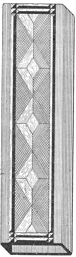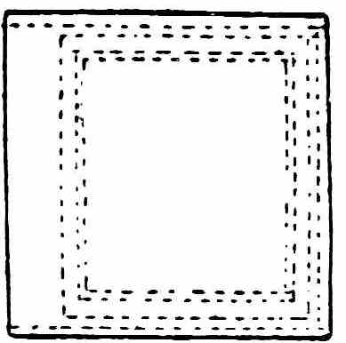 The panel is now in two compartments. Cut two openings across it, one on each side, below the[Pg 136] line of stitches just made, and one to cross them; then stuff the panel with carded flock through these openings, the stuffing-stick being employed for the purpose. Fill it level from top to bottom, but not too full.