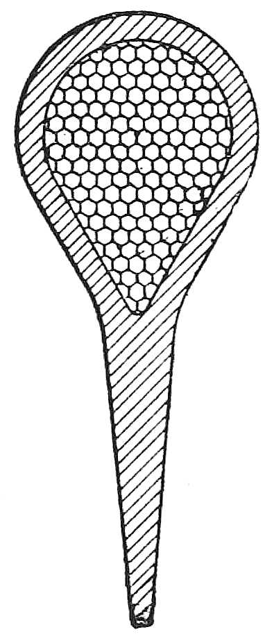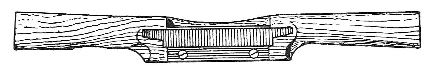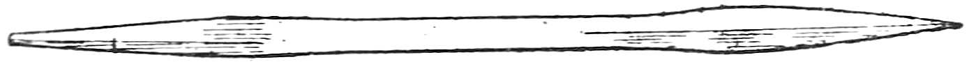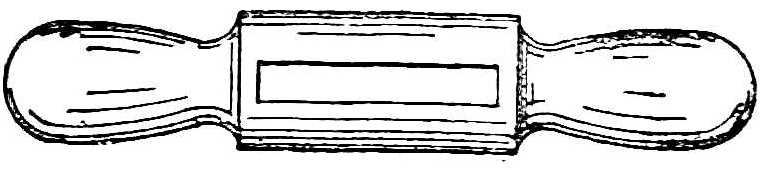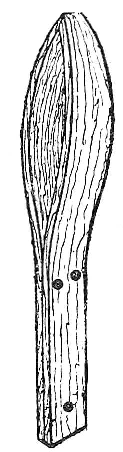Now cut a billet 9 in. by ¾ in., and after shaving one end thin, round the other and prepare and crease it. Put it in the billet and a loop, and stitch the other end fine in the ring; stitch the round along the groove, being careful to have the thread in the centre of the groove at both sides and to catch the points of the turn-down at the ring and the point of the billet in the other end, between the edges of the round part, making two or three stitches in each, thus joining them firmly with the round part. Then with the spokeshave trim them round and neat, rub with coarse glasspaper, and finish with fine; close the edges of the groove well over the stitches and try to make it look as much as possible like one round, solid piece.