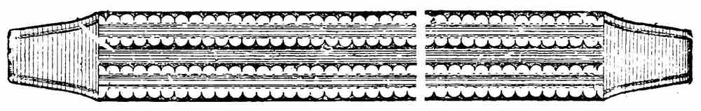 Having a pint of whole linseed near at hand, drive a nail through one end to close the opening, and then, placing the linseed on the apron, scoop[Pg 147] it in with the open end and ram the dock tight from end to end with a stick or iron rod till it is filled. Take one end in each hand and twist the piece to a round shape, endeavouring to bring the stitches on[Pg 148] the lower side. Knock the two ends with nails in them into a flat board, and keeping the centre on the board, raise both sides and draw them as close together as possible with a piece of soft leather tied around them. Then allow them to dry and trim the stitched part and sand it, rounding it with the other parts; polish well, thin the top sides of the points, and knock them flat with the hammer. Stitch one to each slit of the crupper body for about ¾ in., finish the edges, and put about a dozen holes in the billet.