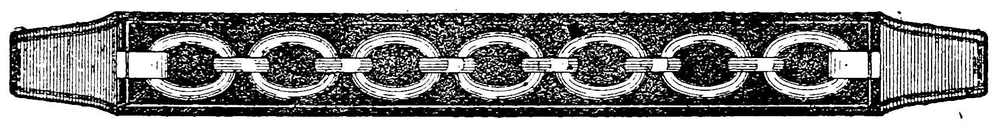 It can be covered with fancy coloured or striped cloth or leather and herring-bone stitched along the centre underneath, making a cross at each end; or a chain front (Figs. 185 to 187) can be employed. In the last case a piece of patent leather must be cut of the same length as the front from one cross line to the other and of the same width as the forehead band; adjust the chain and stitch along its centre, taking the thread out at one side of the chain, and running it through the link and down on the other side close by the chain, and so on through every link; at each end through the link joint make a little chape and stitch double through it when the patent leather is being adjusted to the forehead band.