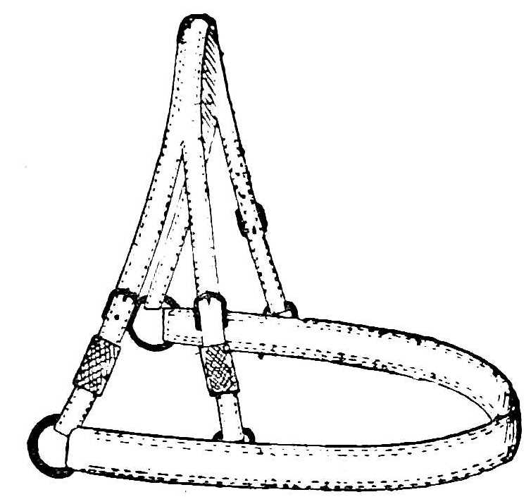 The lay must be stitched in from the underside with double waxed thread, a cross stitch being made at the corners of each opening and the thread being brought straight over the opening to the opposite corner without cutting. Stitch over the loop at the slit end, but no farther, the remainder being stitched fine round the end from above. It is better to stitch the crupper lay from below because it will then be smoother and the stitches will not be so likely to rub the hair off as when they are on the surface, there being much friction at this part. Having placed the stick in the loops, finish with the hot iron, making a running loop for the billet.