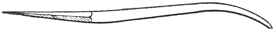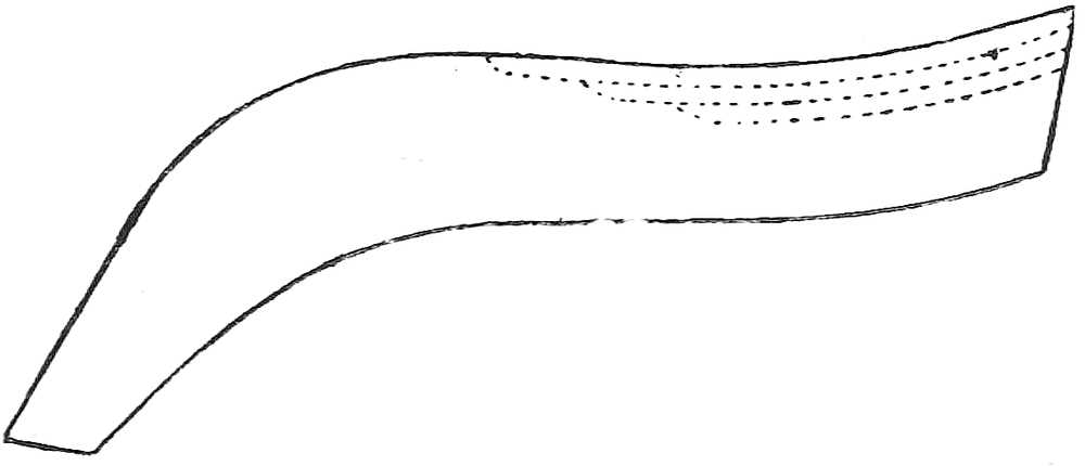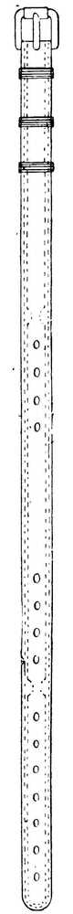 To make the crupper, cut out the body 2 ft. by 1¾ in. and slit it for 8 in. at the strongest end; taper the other end to 1¼ in. wide and cut a 1¼-in. billet 3 ft. 9 in. long. Shave the strong end thin and round the other; cut the lay 16 in. by 1¼ in. and shave one end, rounding the other. The points of the slits and the end of the body must also be shaved, the slit points being tapered. Black and crease them all, only the top of the lay being edged.