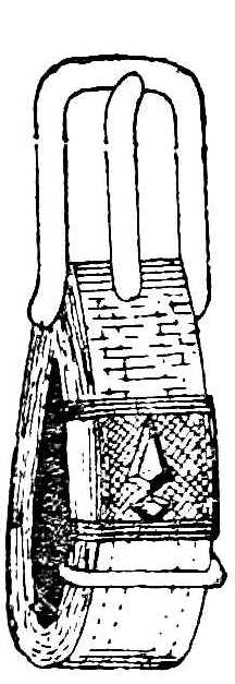 The shape being now obtained, the tug must be filled and thickened. This is done by cutting a piece of leather to fit the inside tight from one side of the buckle to the other, keeping the buckle in position while working. Cut a nick in the centre of each end of this piece so that the tongue and[Pg 152] sides may fit close to the buckle, and then cut another good piece of leather to go round inside tight and to overlap at the top for about 1½ in. Now shave each end and cut a groove on each side for about the length of the loop on the part intended for it, and overlap it on the side opposite the loop just below the buckle, with the outer point of the overlap on the top pointing towards the buckle and not downwards.