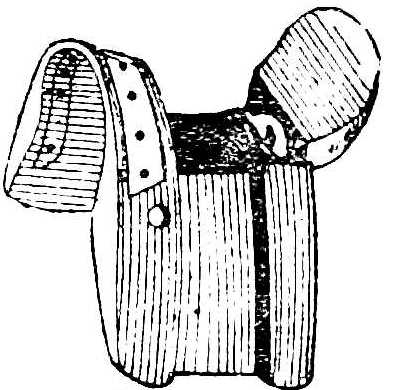 Cut a top cover of strong leather of the same width as the tree and to reach to within 2½ in. from the bottom, so that there will be an opening for the backband; crease it across both ends and bevel the creases with a hot iron, or line both ends for about 2 in. and shave the inner side; then make two rows[Pg 134] of stitching across the points. Place it on the tree in its proper position, and give two or three light taps with a hammer opposite the three openings for the terrets and stand hooks in the sockets; thus the size and position of the holes is marked on the cover.