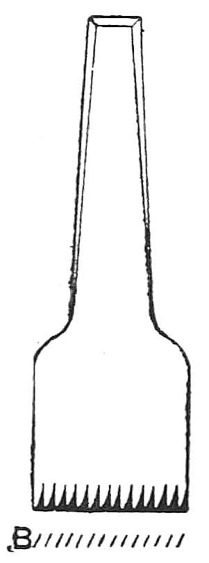 At this point take away the tree, and cut a slit from the outer lower mark to the point of the one running along the side of the tree; there will then be two slits of the width of the board, one on each side of the tree. Now cut upwards from each of the two inner marks at the bottom, for the length of the other cuts and equal in width to the wood, on both sides of the groove. Then cut across the top of each incision from side to side; there will now be one cross cut and four cuts upward, and a portion along the centre. Cut the middle piece between the four slits at each end about 1½ in. from the bottom, and shave the points; now cut the two narrow strips at each end to the same length.