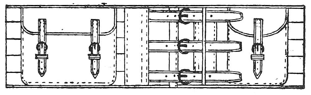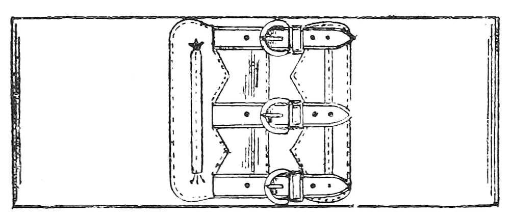 A strap and a girth are needed to fasten to the bottom of the flaps. Cut the girth 2 ft. long and 2 in. wide, and have a lay to put on about 9 in. by 1¼ in. Make a buckle hole in the lay so that the edge of the buckle will be level with the end of the girth, as the chape is not to be turned down, but is stitched on the flat.