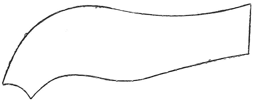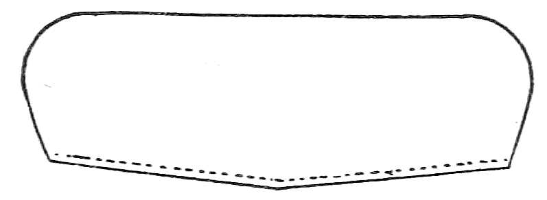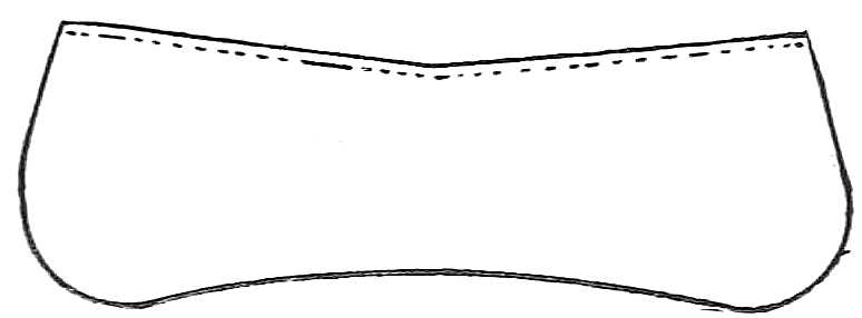 When the material is not long enough it may be cut into two parts and joined at the centre; it is then tacked along the edges and stitched for about six inches. Rub the joint down as flat as possible. Take some blue serge lining or collar lining and lay it out smooth on the bench, and place the panel back on it inside out; with hemp, tack it along[Pg 135] the sides to the lining, cutting the latter to the same shape as the back, but wider by 1¾ in. or more on both sides at the top. The lining then tapers to exactly the same width as the base at the extreme point. Narrow the lining at the gullet and, just at the back in the centre opposite the opening to be left, turn it in about ¼ in.; run a stitch to keep it down, and then whip it in with the facing from end to end and across the bottom, employing black linen thread and a pointed needle and thimble. No facing is placed across the bottom.