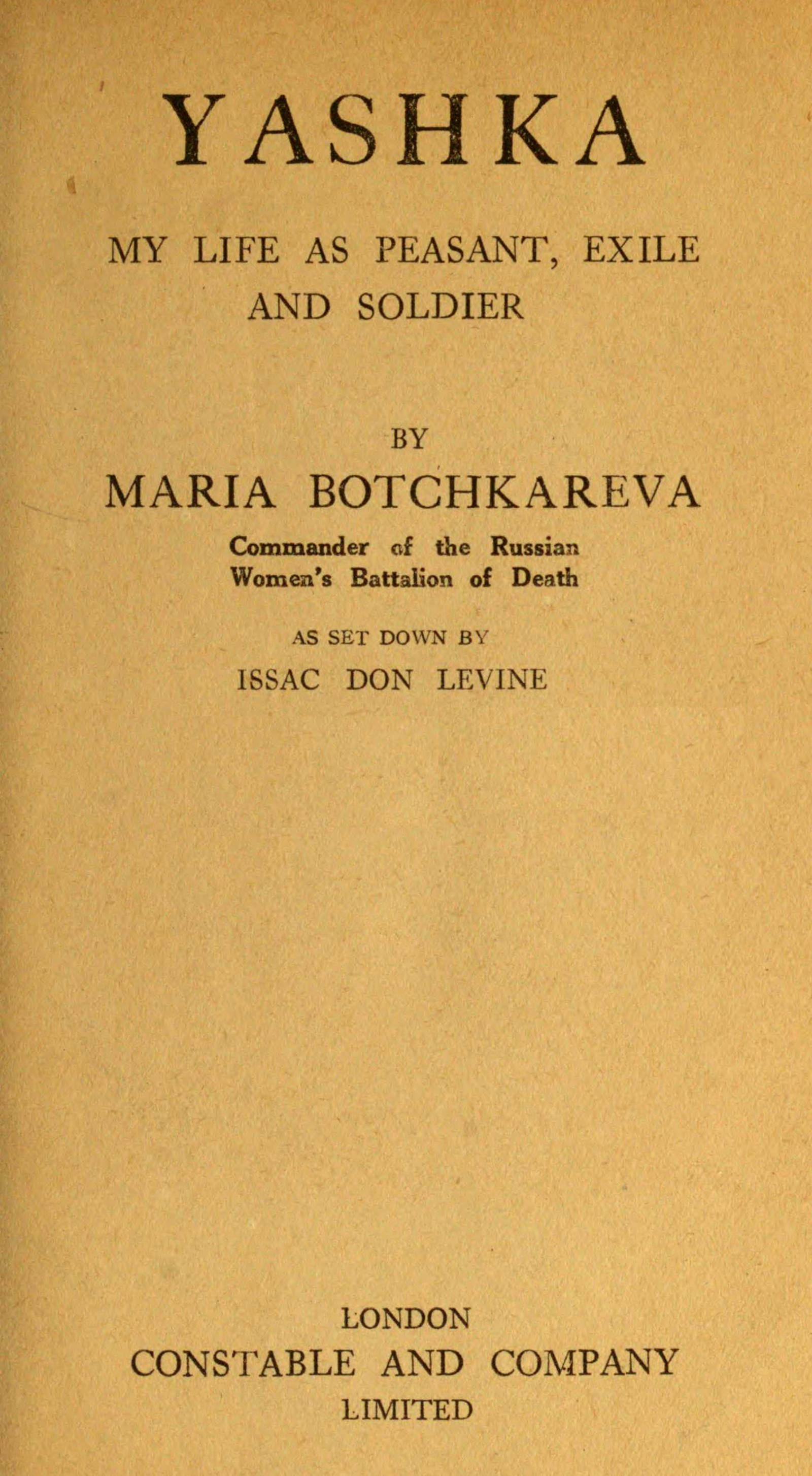 In the early summer of 1917 the world was thrilled by a news item from Petrograd announcing the formation by one Maria Botchkareva of a women’s fighting unit under the name of “The Battalion of Death.” With this announcement an obscure Russian peasant girl made her début in the international hall of fame. From the depths of dark Russia Maria Botchkareva suddenly emerged into the limelight of modern publicity. Foreign correspondents sought her, photographers followed her, distinguished visitors paid their respects to her. All tried to interpret this arresting personality. The result was a riot of misinformation and misunderstanding.
