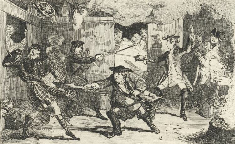"Claymore!" cried the leader of the Highlanders, and a scuffle instantly commenced. The officers of the law, surprised at so sudden an attack, and not usually possessing the most desperate bravery, made but an imperfect defence, considering the superiority of their numbers. Some attempted to ride back to the Hall, but on a pistol being fired from behind the gate, they conceived themselves surrounded, and at length galloped of in different directions. Rashleigh, meanwhile, had dismounted, and on foot had maintained a desperate and single-handed conflict with the leader of the band. The window of the carriage, on my side, permitted me to witness it. At length Rashleigh dropped.