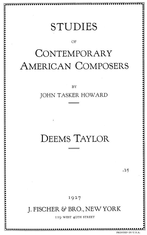 And so it becomes apparent that Deems Taylor the man is quite as important as Deems Taylor the composer. No record of his achievements in the latter capacity is complete without mention of the sterling qualities that he built within his own character. The chronicler of his history finds no evidence on this point more startling nor convincing than the happy, friendly relationship[Pg 20] which exists between him and his publisher. Here indeed is a miracle, as witness the biographies of scores of the great composers of all times and observe the bickerings and transactions of distrust which have marked their dealings with the men who gave out their music to the world.