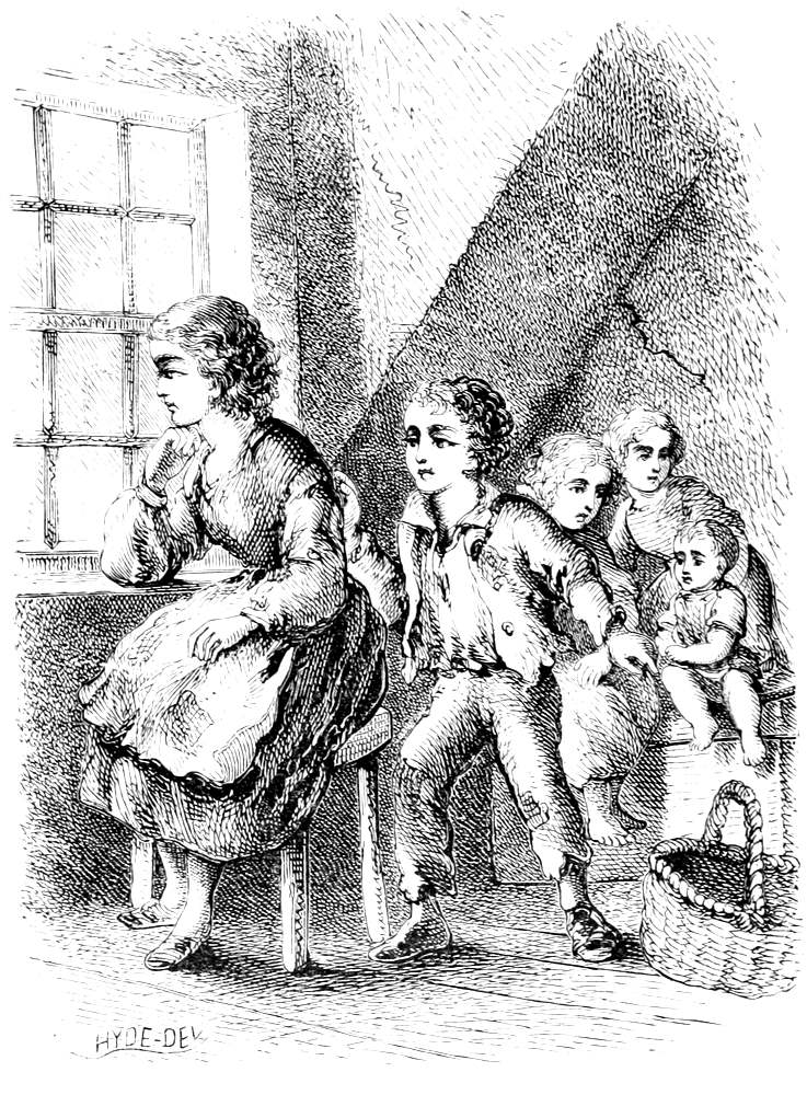 It was, as I said, one night after a visit to old Madame Hansmann that Berty’s wish came into her heart. She was sitting in her attic, striving patiently, by the light of a candle-end which Biddy had given her, to fashion a frock for little Fritz from an old one of her own. She was not a very skilful seamstress, and her materials were none of the best; so, as you may imagine, she was much too busy at first to pay much attention to the children’s chatter, as they frolicked and tumbled upon the old straw bed in the corner. Presently, however, having planned out her work to her mind, her attention was attracted by their talk.