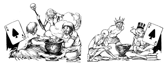 "Oh, the Balance!" said the woman with black button eyes, throwing down her last two cards. "Sometimes I think we ought to upset it ourselves." She evaded the shocked glance of the silver-haired woman. "We've our Sounds, and our Pictures, and our Numbers, and our Cards. We could finish the Saylors in a whiff. There's such a neat trick with cards I've just learned. Here, let me show you—" She slipped a dozen shiny paste-board oblongs out of her purse. They had the conventional backs, but their faces bore representations of a cryptic sort.
