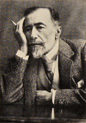 IN the autumn of 1922 New York began to witness a play by John Galsworthy, called Loyalties. Not only the extreme smoothness of the acting by a London company but the almost unblemished perfection of the play as drama excited much praise. Because, of the two principals, one was a Jew and the other was not, with consequent enhancement of the dramatic values in several scenes, it was said (by those who always seek an extrinsic explanation) that Loyalties simply could not have avoided being a success in New York. The same type of mind has long been busy with the problem of Mr. Galsworthy as a novelist. It read The Man of Property and found the book explained by the fact that the author was a Socialist. Confronted with The Dark Flower, it declared this “love life of a man” sheer sentimentalism (in 1913 there was no Freudianism to fall back on). And the powerful play called Justice[Pg 14] was accounted for by a story that quiet Mr. Galsworthy had “put on old clothes, wrapped a brick in brown paper, stopped in front of a tempting-looking plate-glass window” and let ’er fly. On being “promptly arrested,” he “gave an assumed name, and the magistrate, in his turn, gave Galsworthy six months. That’s how he found out what the inside of English prisons was like.”