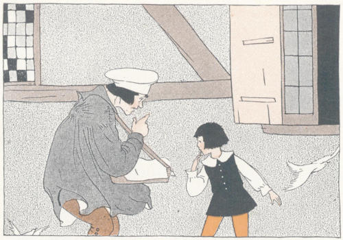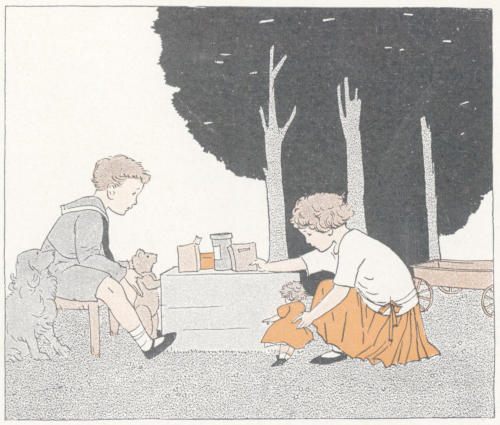 The shoemaker, and in fact all the characters included in this book, may be treated in a similar way. If something more permanent than block-building is desired, let the children bring small dry-goods boxes or boxes of cardboard or corrugated paper and fit them up for shops and stores. The furniture for such toy shops can be made of blocks of suitable size glued together, or by use of small cardboard boxes and[198] empty spools. Children are able to find ways and means of making such furniture, but they should not be deprived of the opportunity of seeing good forms made by others. At this period in the child’s life finished workmanship is not the aim. The product is of minor importance in comparison with the activity itself and its place in developing clear mental images.