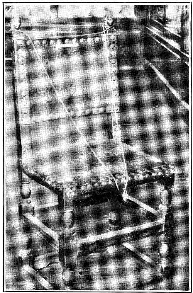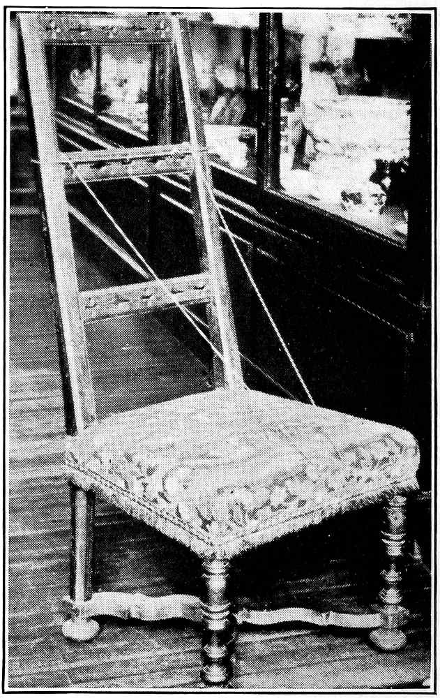 The chair shown in Fig. 4 is an English ladder-back side chair from the seventeenth century. Here we have both comfort and practicability combined. The seat is built up with webbing, canvas and stuffing, and covered with a needlework tapestry. It is finished with a fringed gimp with brass headed nails.