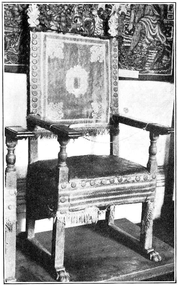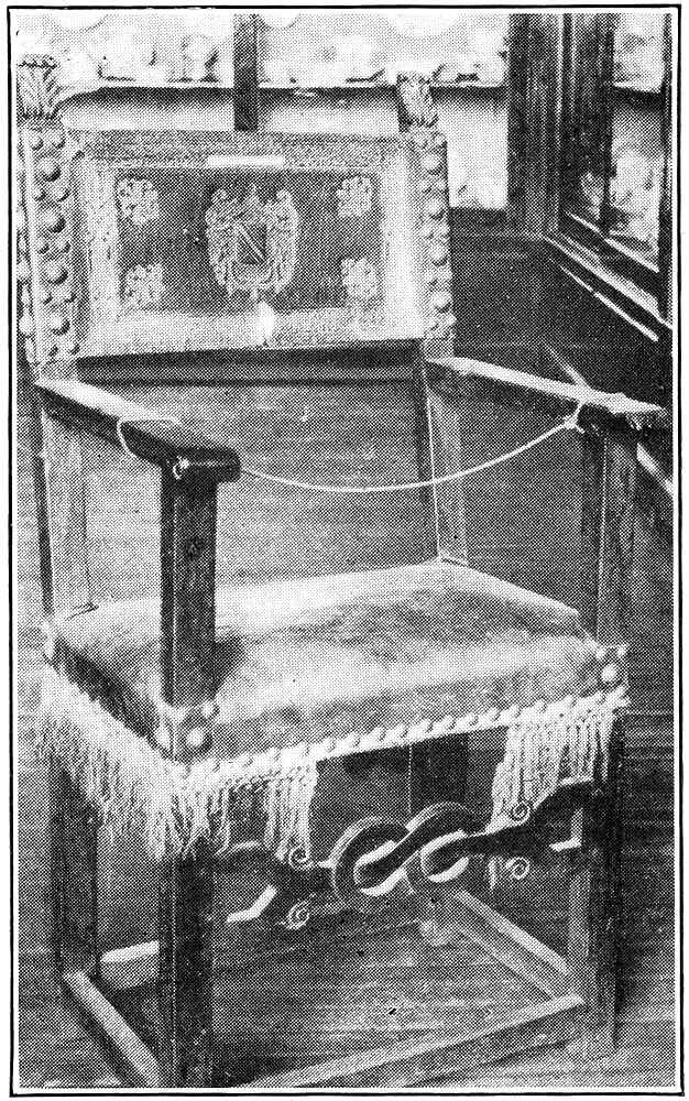 The arm chair illustrated in Fig. 3 is Italian, from the sixteenth century. It has carved finials but no turned work. The leather back is tooled, and gilded with an elaborate design. The leather seat has been blocked up from below to maintain the original appearance, and the leather is not the same grade as used on the back. Round headed nails, of two sizes, and the fringed gimp, complete the ornamentation.