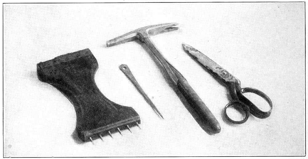 TOOLS.—The only tools needed in simple upholstery, besides those in the average manual training shop, are a gimp hammer, a webbing stretcher, a pair of scissors, a regulator and straight and curved needles. In Fig. 5, from left to right are illustrated: webbing stretcher, regulator, gimp hammer and a pair of scissors.