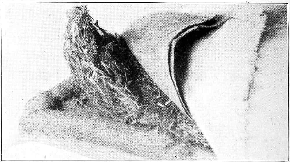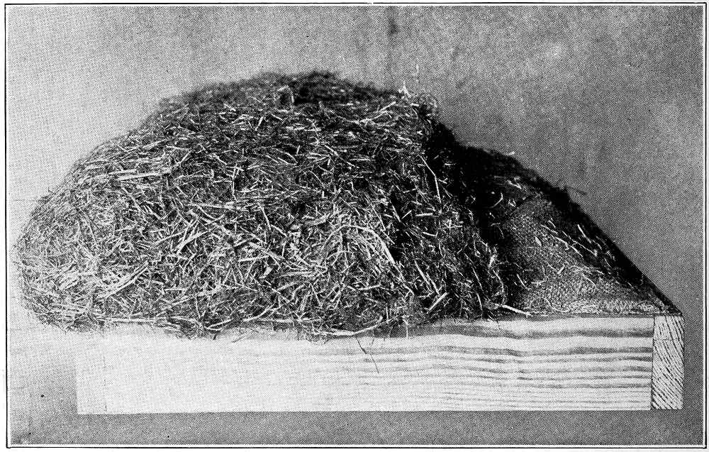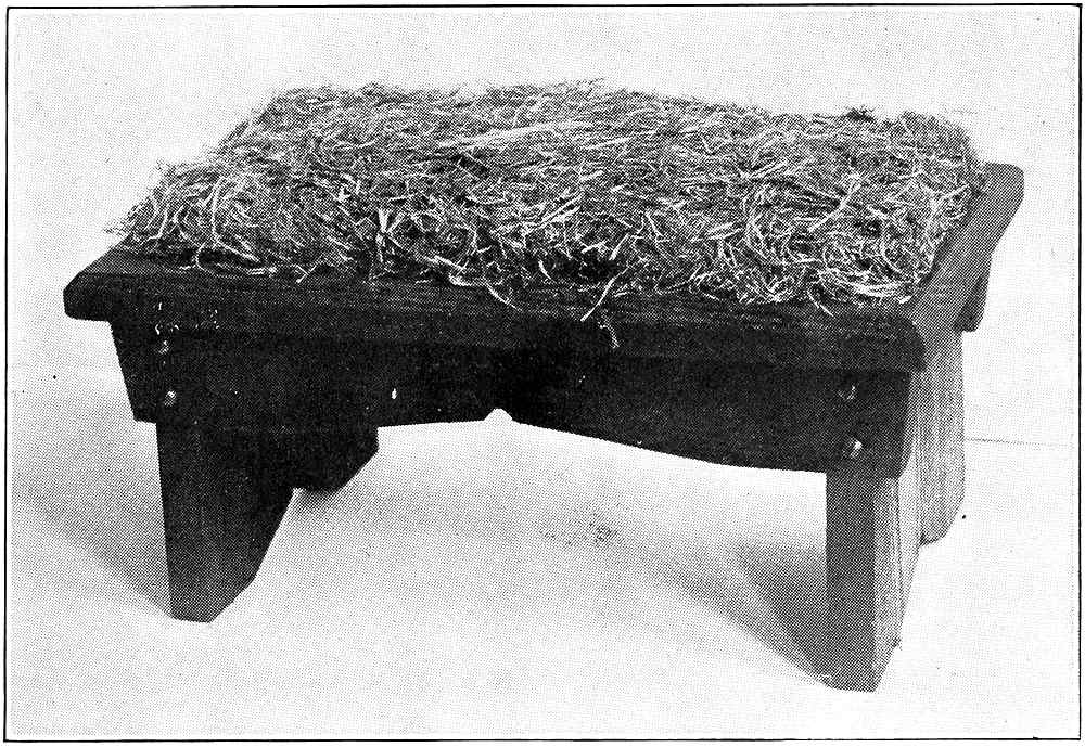 Several kinds of material may be employed for stuffing. The very best material available is curled horse hair. It is also the most expensive, costing from 30 to 65 cents per pound depending upon quality. The stuffing recommended for such work as ours is tow. This may be purchased by the 100-pound bale at a cost of 2[Pg 13] cents per pound. There are three grades of tow: fine, medium and coarse. The fine variety should be used, for the coarser kinds are hard to manipulate and result in uneven surfaces after a period of use. Even with the medium grade of tow it is necessary to use a layer of wadding over it to prevent ridges showing thru the cover. Other stuffing materials are moss, kapok, alva, and excelsior. Cork shavings are generally used for boat cushions.