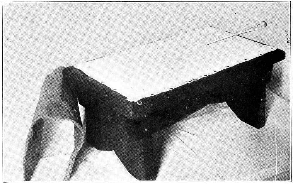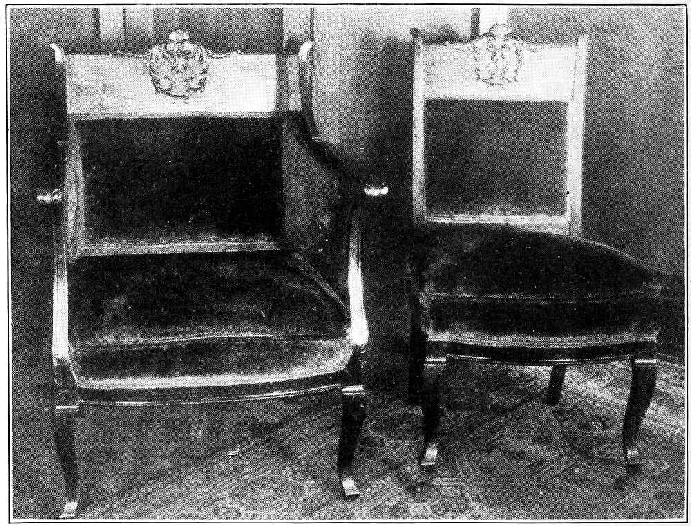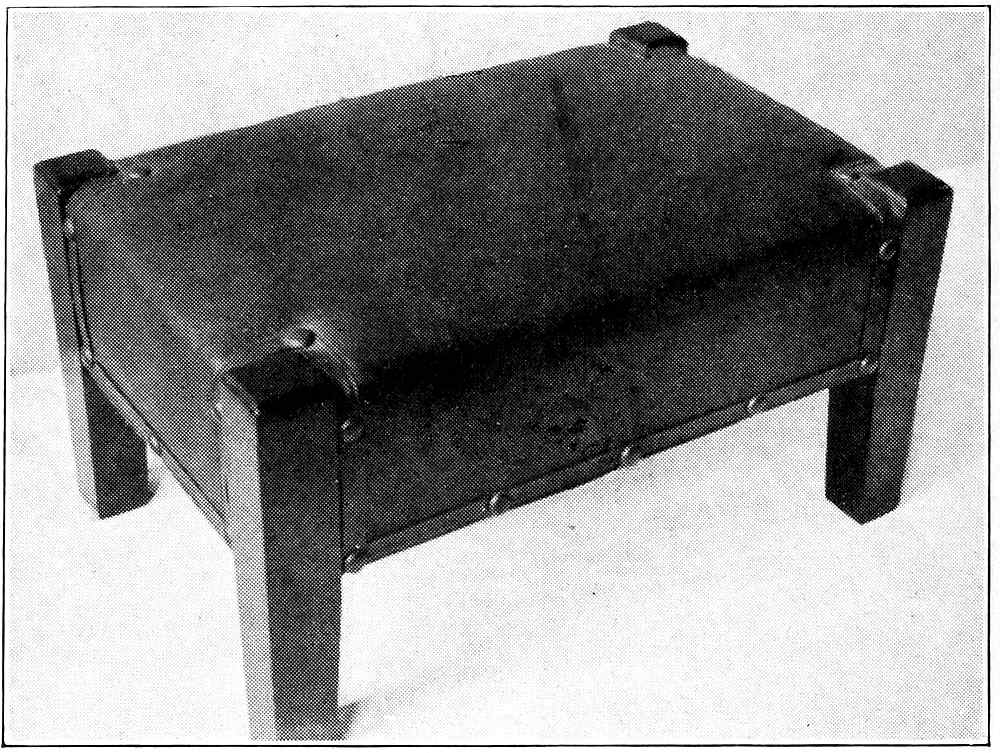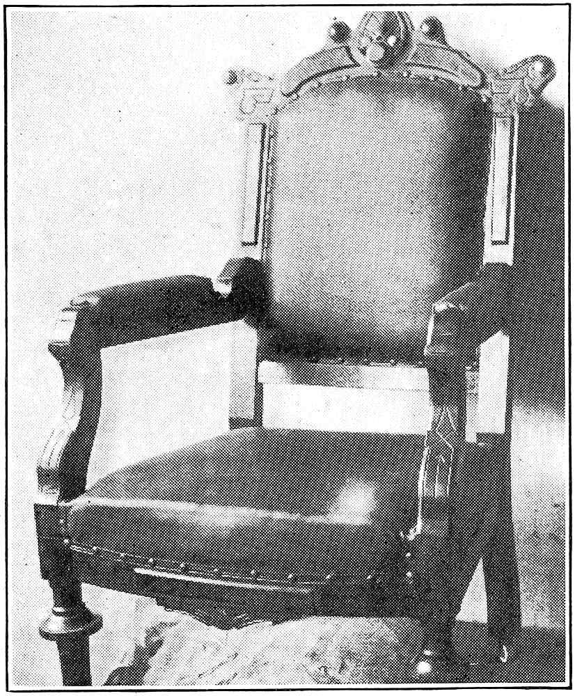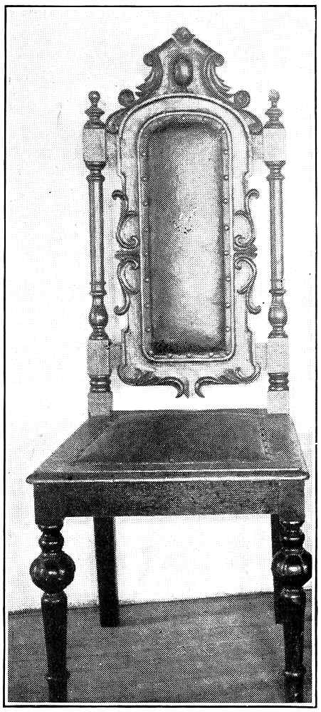 The Flanders chair shown in Fig. 1 is done in leather. It is one of two side chairs from the seventeenth century. One has a plain leather back; the other is tooled, illustrating a decorative coat of arms. The leather in this chair is made thick and rigid by the use of a stiff paper core, on both sides of which is glued a jute-like fabric, and over this the leather. This makes a five ply composition of almost everlasting wearing qualities, but very susceptible to checking and cracking.