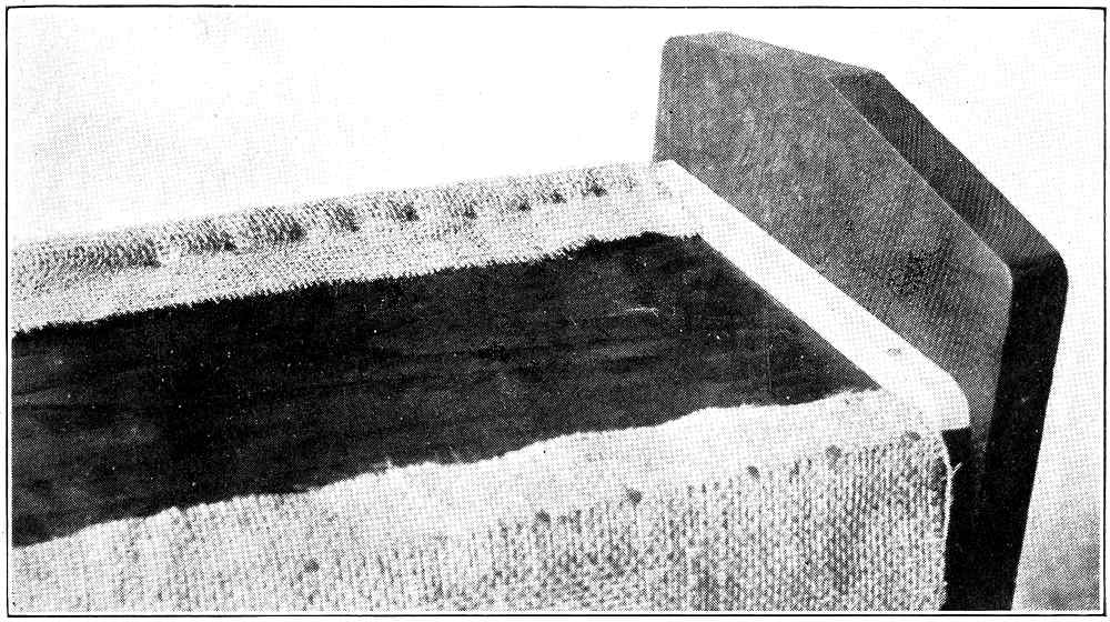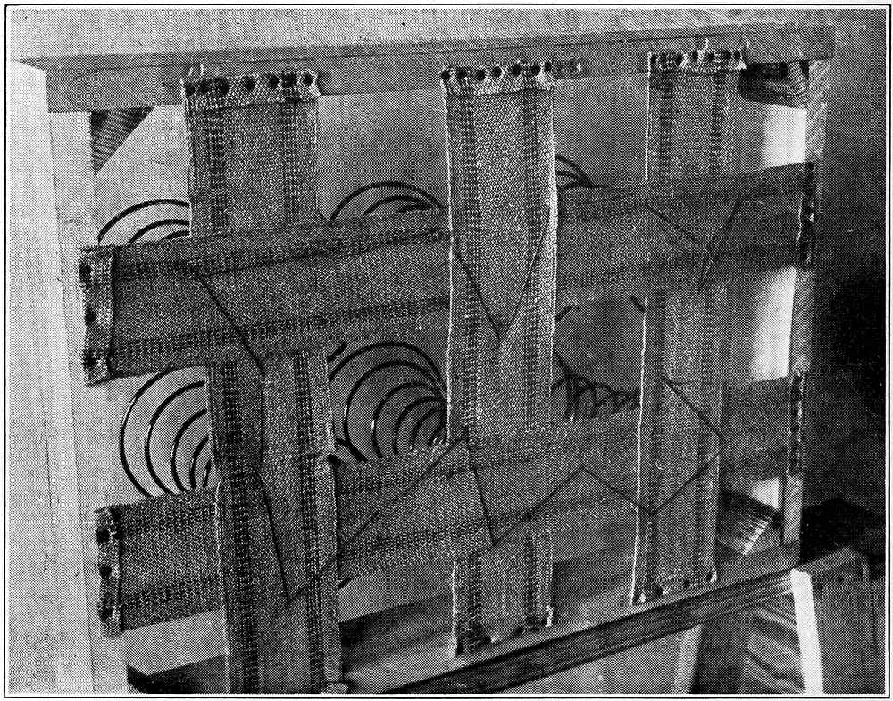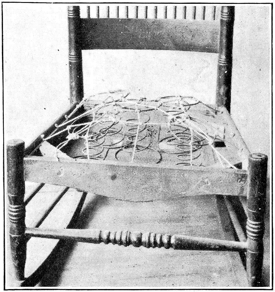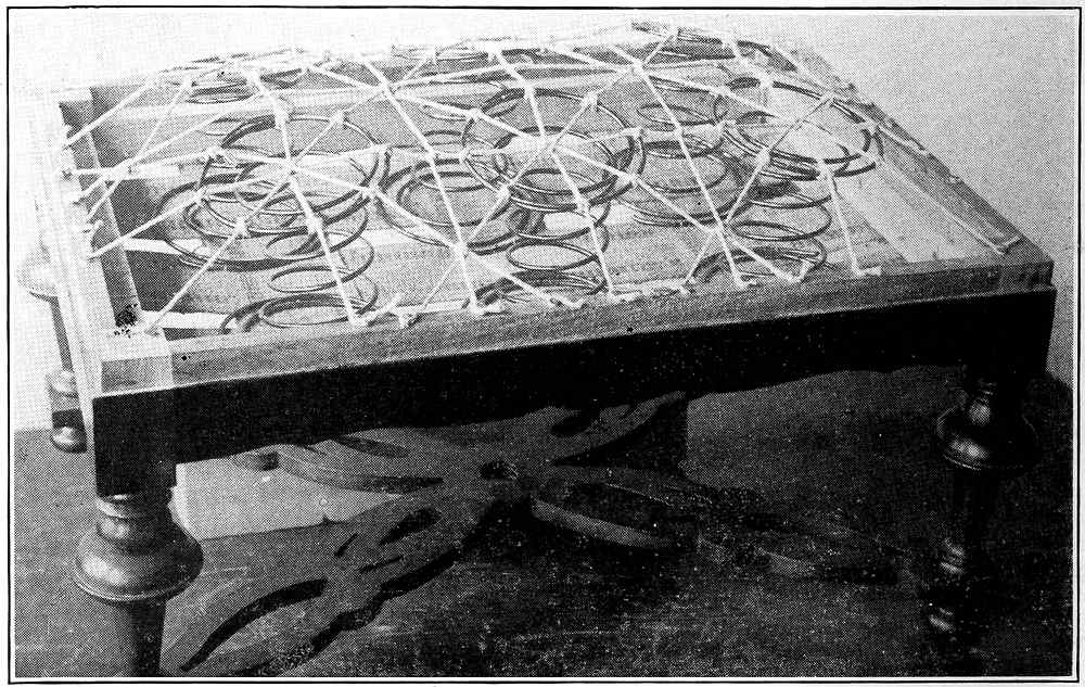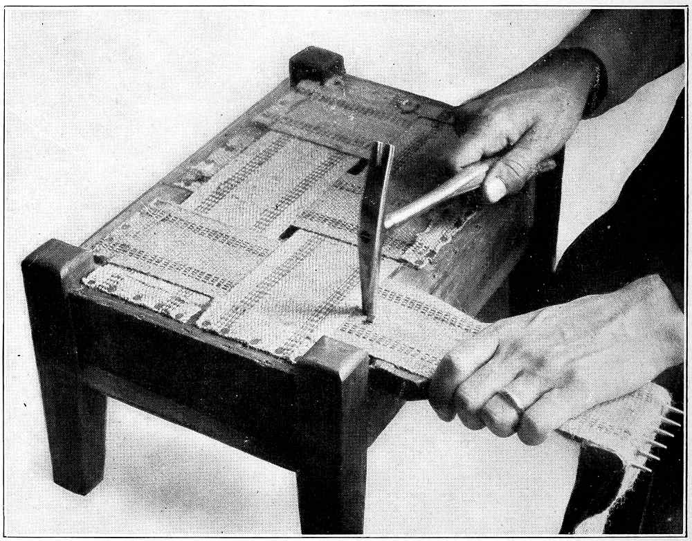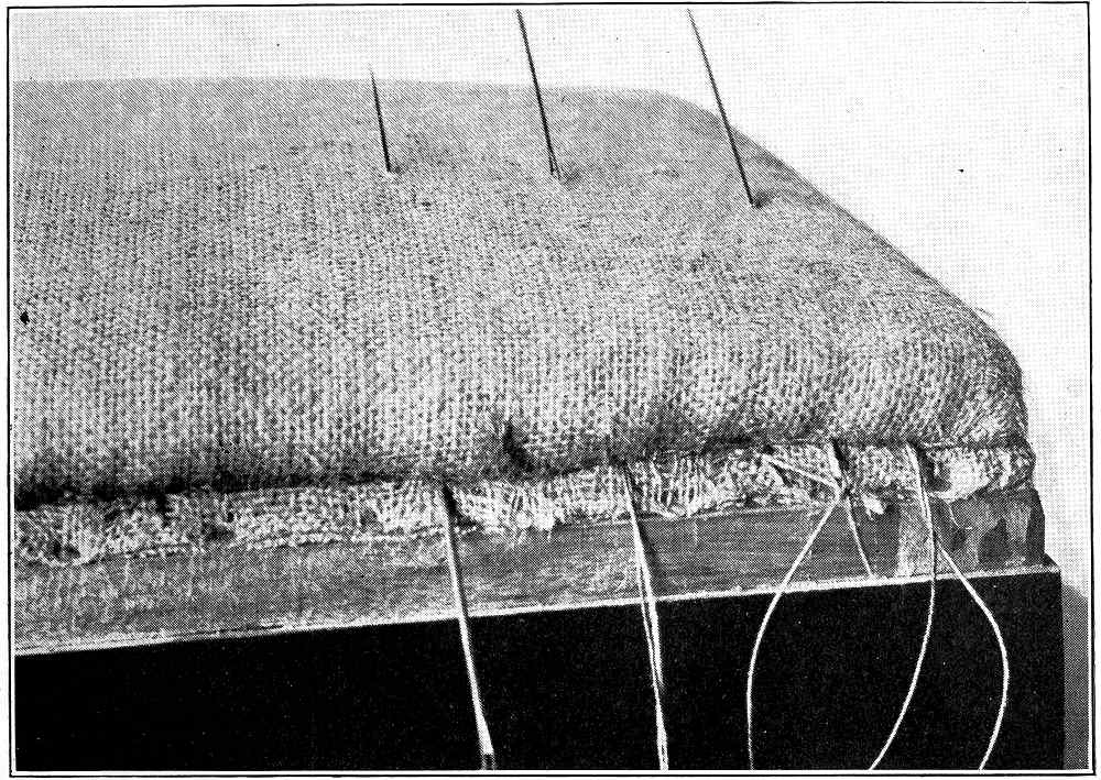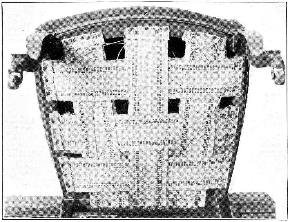 The webbing is tacked on the inner edges of the back, otherwise the rabbet would prove too shallow to permit the gimp to run flush with the wood surface. The stuffing should be stitched to the burlap and webbing. This holds all firmly together.