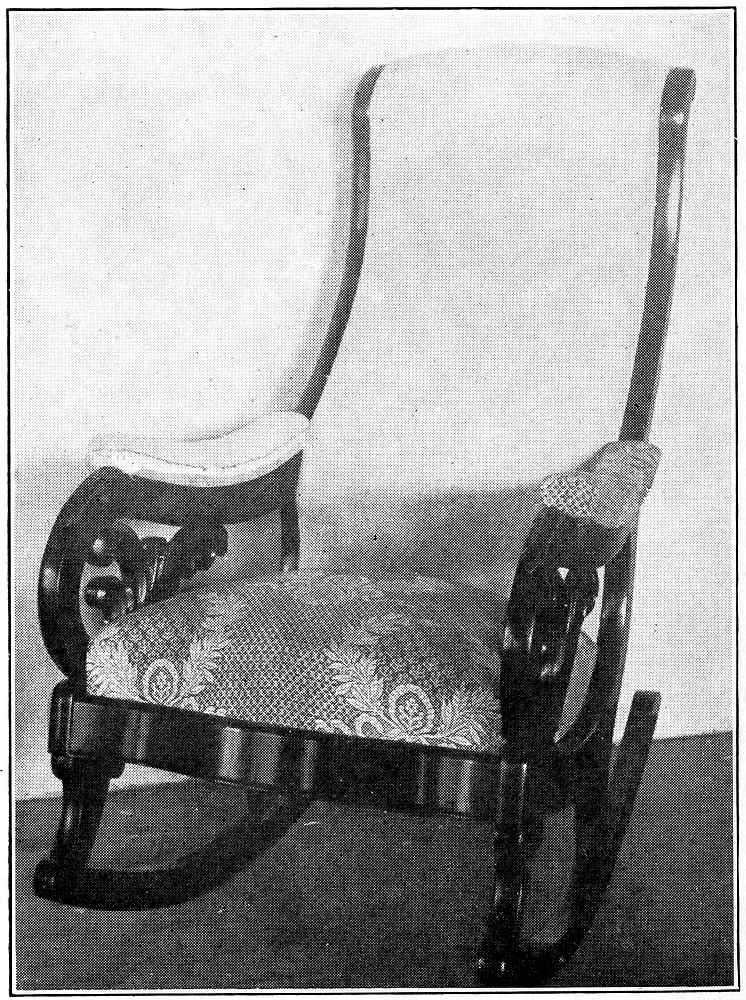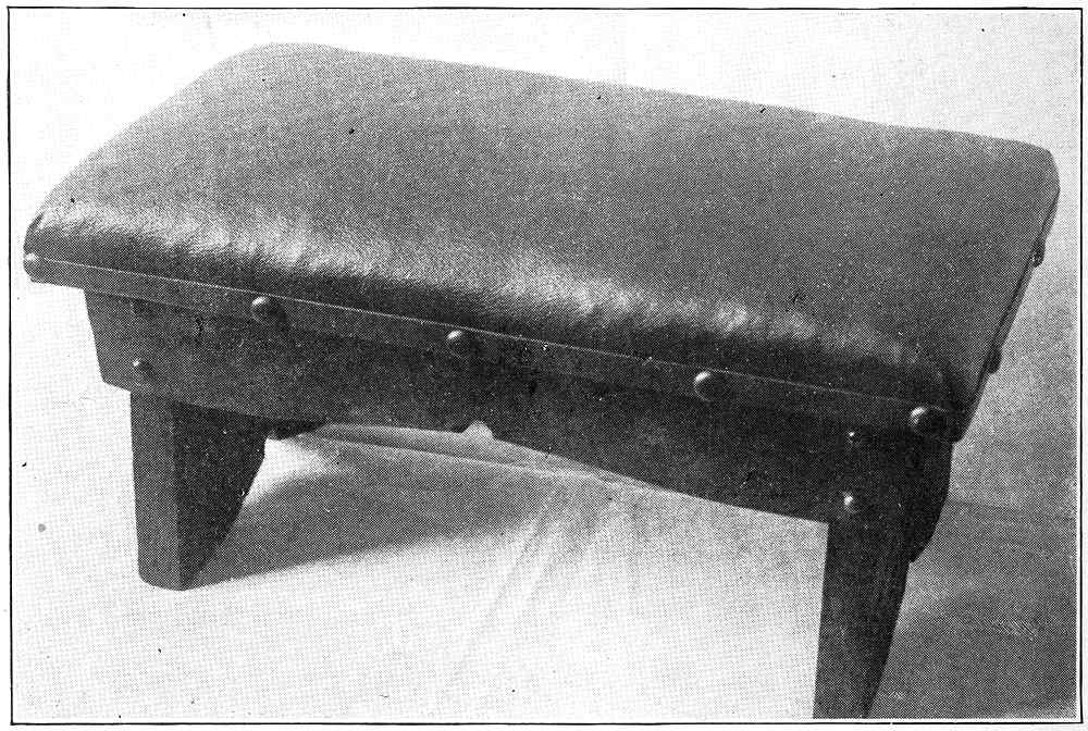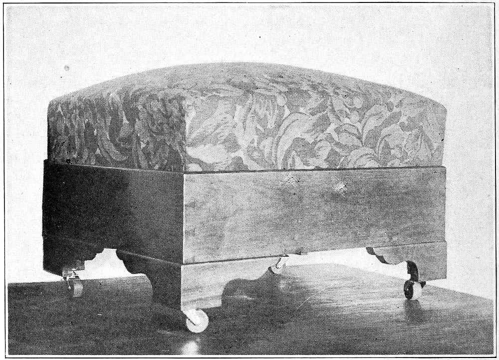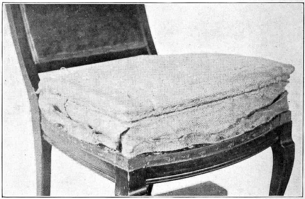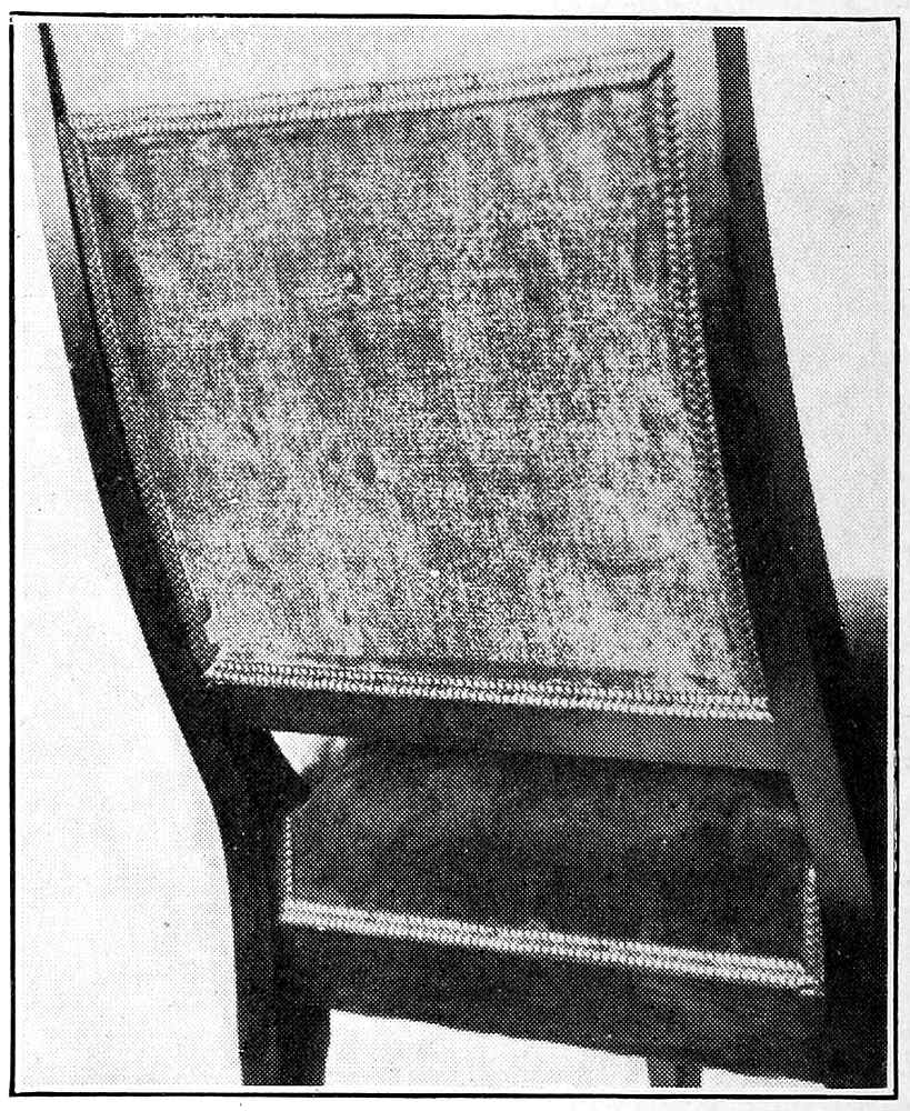 OLD FURNITURE.—Many heirlooms and other pieces of old furniture may be repaired by reglueing and replacing parts, or[Pg 51] by re-upholstering, and the whole refinished so that it will compare favorably with fine pieces of furniture. A piece of furniture of this kind is illustrated in Fig. 46. The treatment of the seat is somewhat different from that described before. The front edge has a hard edge, identical to that described in Chapter VI. The edges at the sides and back need no sewing; at least, they require very little stitching.