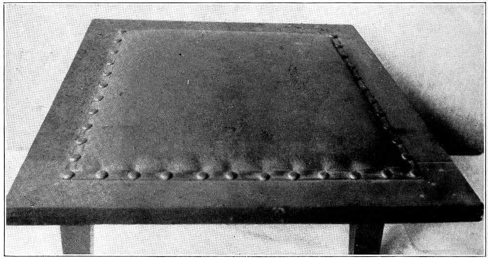 The arm chair shown in Fig. 2 is Italian, from the early seventeenth century. It has carved finials. Webbing is used as a foundation for the seat, over which a jute-like fabric is fastened. A canvas fabric is placed over this. The stuffing is placed over this and covered with leather, which is nailed to the structure with large, flat,[Pg 9] brass-headed nails. The edging is a fabric gimp with fringed edge.