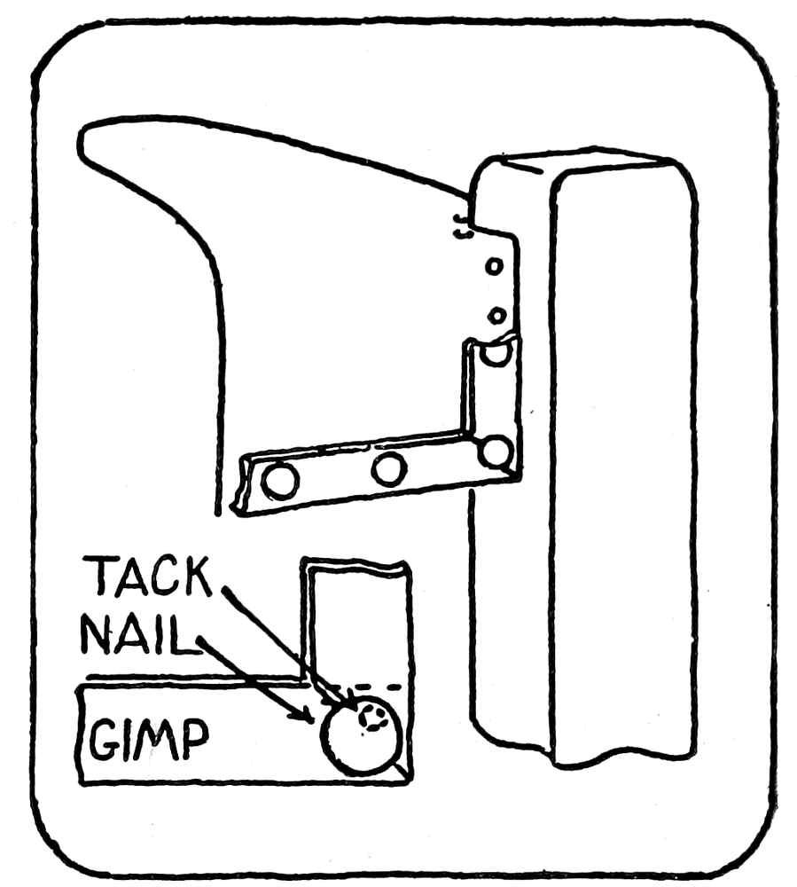 Gimp is a narrow edging used for covering raw edges of the cover and heads of common tacks which secure the cover. It comes in rolls of 25 to 36 yards. Black imitation leather gimp costs 20 cents a roll of 25 yards, and brown or Spanish, 35 cents. Cloth gimp costs from 2 to 3 cents a yard.