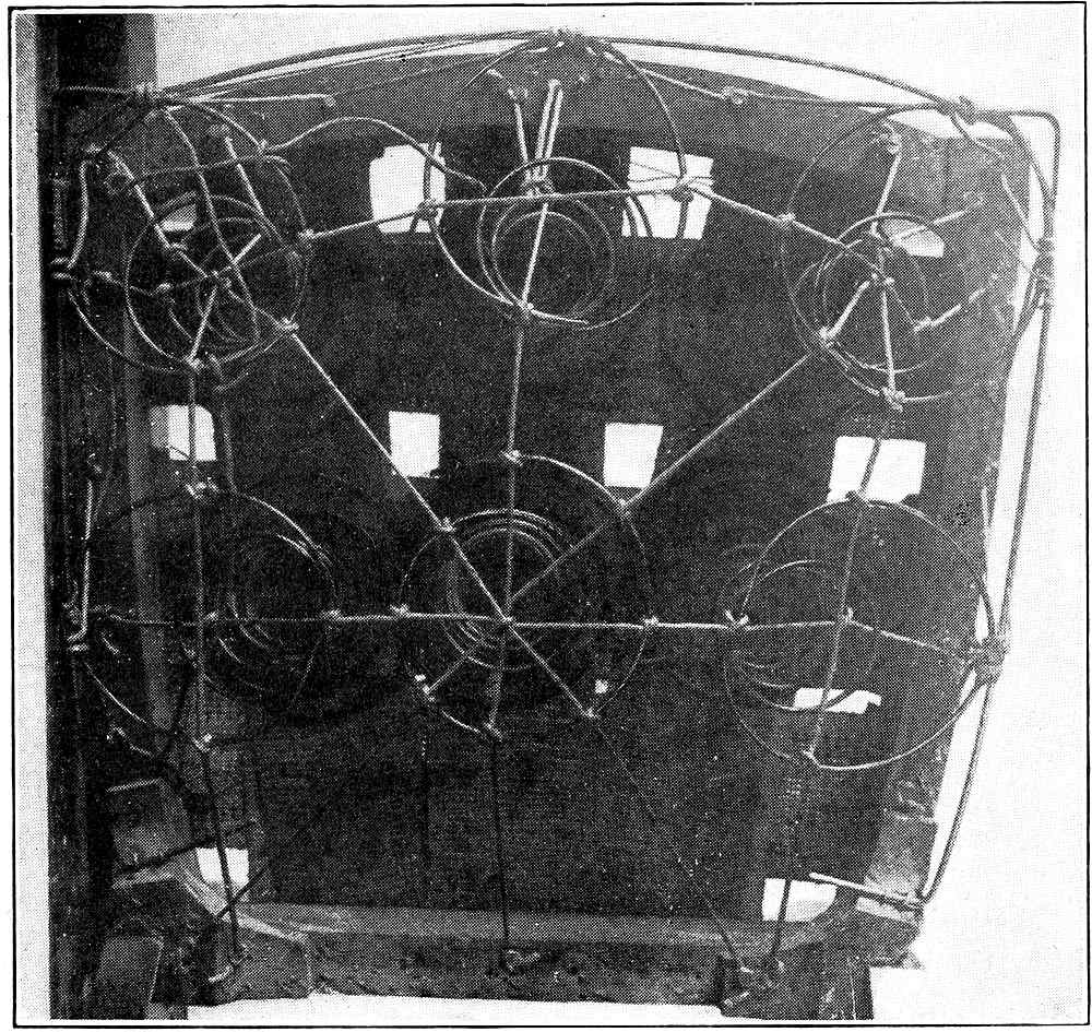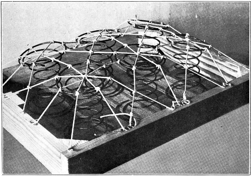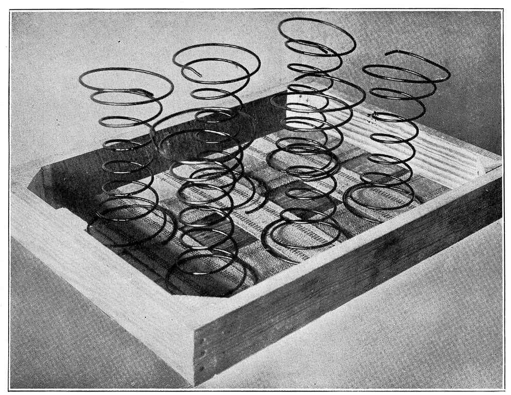Fig. 52 shows the seat in a natural view. Note the method of tying the springs. This is different from the method previously described. The twine is brought down inside of a spring and tied to a second or third coil instead of over the outside top coil. This permits the top coil to lie horizontal, and braces the spring so it remains vertical. Fig. 51 also illustrates this method. A twine is also tacked to the top of the frame and carried up to the spring wire and down to the frame again. It is clearly shown in Fig. 52. This twine braces the springs and prevents sagging, and results in a vertical motion rather than partially horizontal when the seat is used.