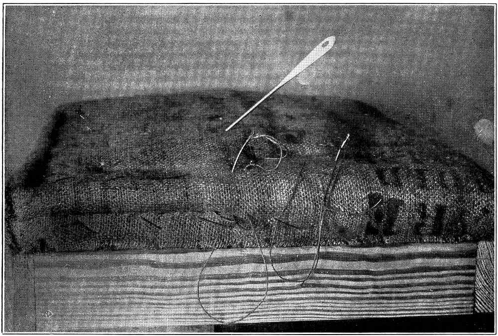 Two needles are required, a straight double pointed one 12 inches long, and a curved single pointed one 6 inches long. Several other kinds will facilitate work, however. A straight, double pointed 6-inch needle is convenient for sewing springs to webbing and triangular pointed needles are best adapted for sewing leather.