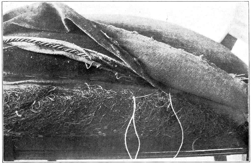 Burlap is the best material to use over webbing and over springs. It will not rip and tear as readily as most textiles and it is therefore a preferred material. Burlap comes in three weights: light (8 oz.), medium (10 oz.), and heavy (12 oz.). The medium weight is best adapted for our work. This may be purchased for 9 cents a yard. It is 40 inches wide. Used burlap may ordinarily be purchased at local dry-goods stores for about 5 cents per pound. Even considering waste, this is much cheaper and quite as good as new burlap for the work intended.