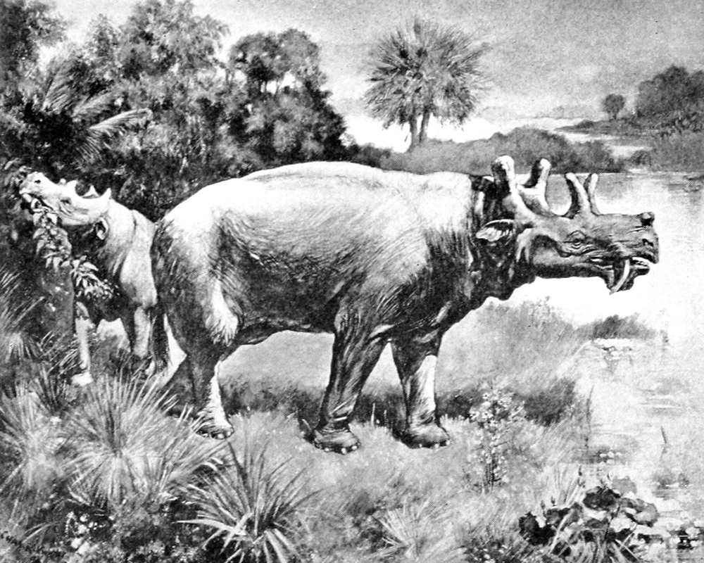 Arsinothere of three million years ago impaling a carnivorous creodont, somewhat resembling a hyena.