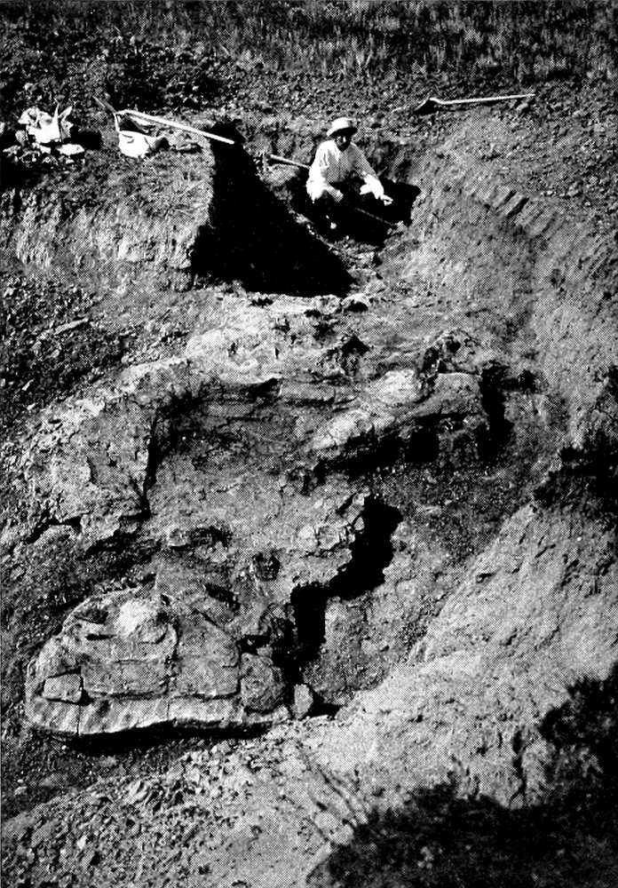 As the dawn broke, three riders, at full speed, guided by the light of the fire, came dashing down the ravine, and the first rays of the rising sun[Pg 348] showed them the boy asleep, pillowed on the outcrop of a Brachiosaurus, which later quarrying was to prove one of the finest of its kind.