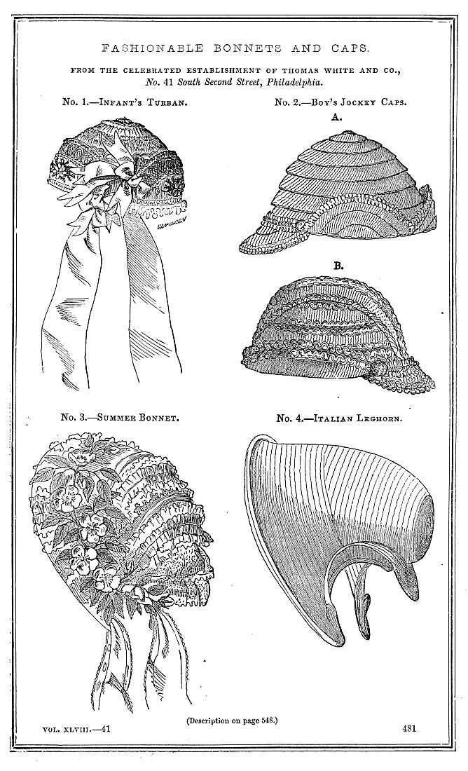 Leghorn bonnets are still worn, though in July and August more dress hats of silk, crape, and lace will be seen. The Leghorns are in unusually good shapes, and trimmed very simply, either with straw, marabout plumes, or plain white ribbons. We speak of the prevailing styles; of course, many tastes are to be suited, and some people would flounce a moir antique with the same, if they thought it would look more expensive, and for this class of community ribbons and garlands cannot be too profuse even on a Leghorn, which, if handsome, is generally considered, like a rich silk, to "have no need of ornament." There is a profusion of plain straws of every shape and cost. We notice that they come close, or nearly so, under the chin, and the whole bonnet is a gradual slope from the brim to the crown. They are trimmed in every variety of style, ruches of narrow ribbon box-plaited on, numerous flat bows of ribbon an inch in width disposed as a wreath, etc. etc. Ribbons, as a general thing, are much narrower than the past season, and those long scarf-like strings are not considered in good taste. We have before spoken of the profusion of trimming inside the brim. Blonde caps—a narrow edge of blonde usually sewn upon a broad or wash-blonde lace—are usually almost invariably used to soften the effect of the flowers and ribbon bows that encircle the face. The flowers used are of the most delicate description, made of crape, in strict imitation of nature. Flag flowers, convolvulus, lilac sprays, field violets, and all the more delicate blossoms, are exquisitely reproduced.