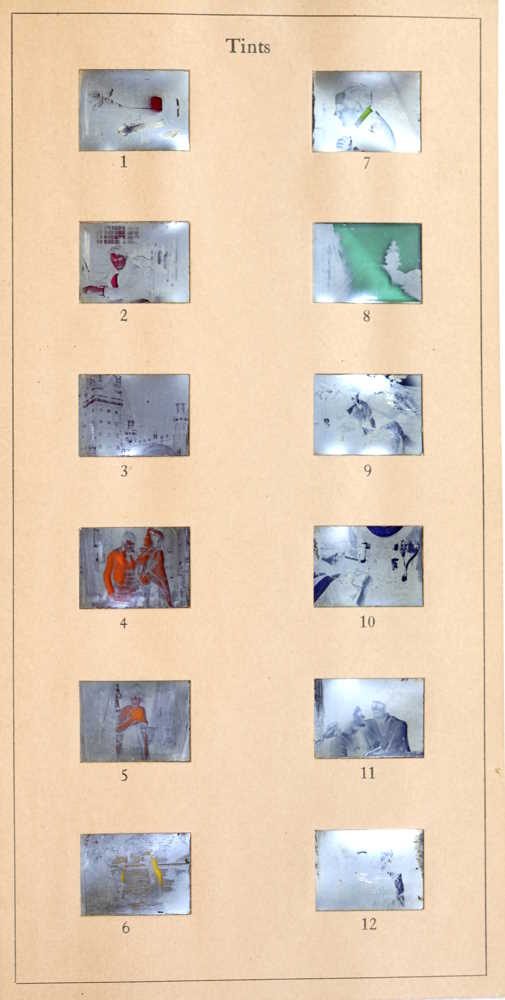 It is considered unnecessary to illustrate every combination of tone and tint above, so that only typical examples are given. It must be noted that toned film (except tones A and F) absorbs the dye more quickly than untoned film, so in order to duplicate appended samples, the dye-baths should be diluted accordingly.