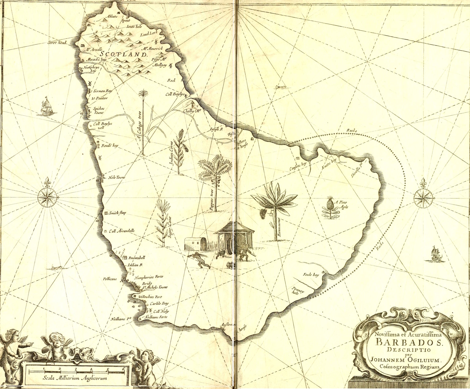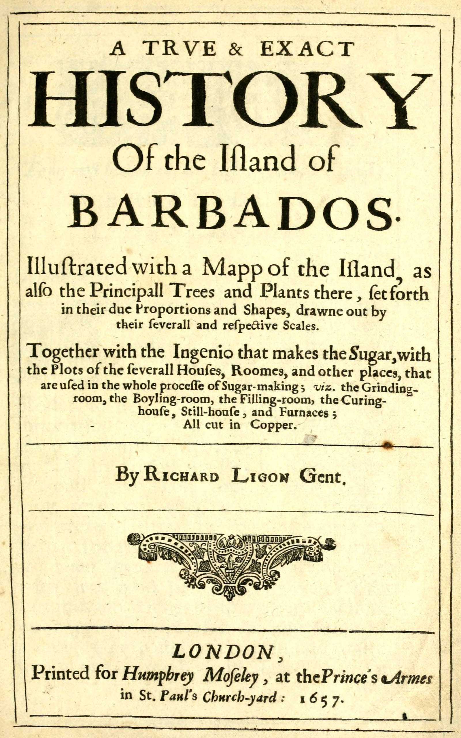 HAVING been Censur’d by some (whose Judgements I cannot controll, and therefore am glad to allow) for my weakenesse and Indiscretion, that having never made proofe of the Sea’s operation, and the severall faces that watry Element puts on, and the changes and chances that happen there, from Smooth to Rough, from Rough to Raging Seas, and High going Billowes, (which are killing to some Constitutions,) should in the last Scene of my life, undertake to run so long a Risco as from England to the Barbadoes; And truly I should without their help conclude my selfe guilty of that Censure, had I not the refuge of an old proverb to fly to, which is, (Need makes the old wife trot:) for having lost (by a Barbarous Riot) all that I had gotten by the painfull travells and cares of my youth; by which meanes I was stript and rifled of all I had, left destitute of a subsistance, and brought to such an Exigent, as I must famish or fly; and looking about for friends, who are the best supporters in so staggering a condition, found none, or very few, whom griefs and afflictions had not deprest, or worne out, Banishment absented, or Death devour’d; so that in stead of these neere and Native comforters, I found my selfe a stranger in my owne Country, and therefore resolv’d to lay hold on the first opportunity that might convoy me to any other part of the World, how far distant soever, rather then abide here. I continued not many weekes in this expectation, when a friend, as willing to shift his ground as I, gave me an Overture which I accepted, and so upon the sixteenth day of June 1647. we embark’d in the Downes, on the good Ship called the Achilles; a vessell of 350 tunnes the Mr. Thomas Crowder of London; and no sooner were we all aboard, but we presently weighed Anchor, and put to Sea; in so cold weather as at that time of the yeere, I have not felt the like; and continued so till wee came to Falmouth Harbour: where wee put in, and rested for a night, but in our passage thither, were very uncertaine upon what Coast wee were, by reason of the unsteadinesse of the windes, and cloudinesse of the weather; so that I perceived more troubles and[2] doubts in the Seamen in that short passage, than in all the voyage after. But, the weather clearing up, the Master and Mates drew out severall plots and Landscapes: which they had formerly taken upon the Coast of France and England, (which are of great use in the narrow Seas,) by which they were well assured where they were; for there they seldome use Loggline, or Backstaffe, but attend onely the Tides Compasse, and Card; nor is there any use of other directors in so narrow a roome. We were (as I remember) about 10. dayes sayling to Falmouth, and had with us a small ship of about 180. tunnes, called the Nonesuch; of which Captaine Middleton was owner, a very good seaman, and a Planter in Barbados: but himselfe then remaining in London.