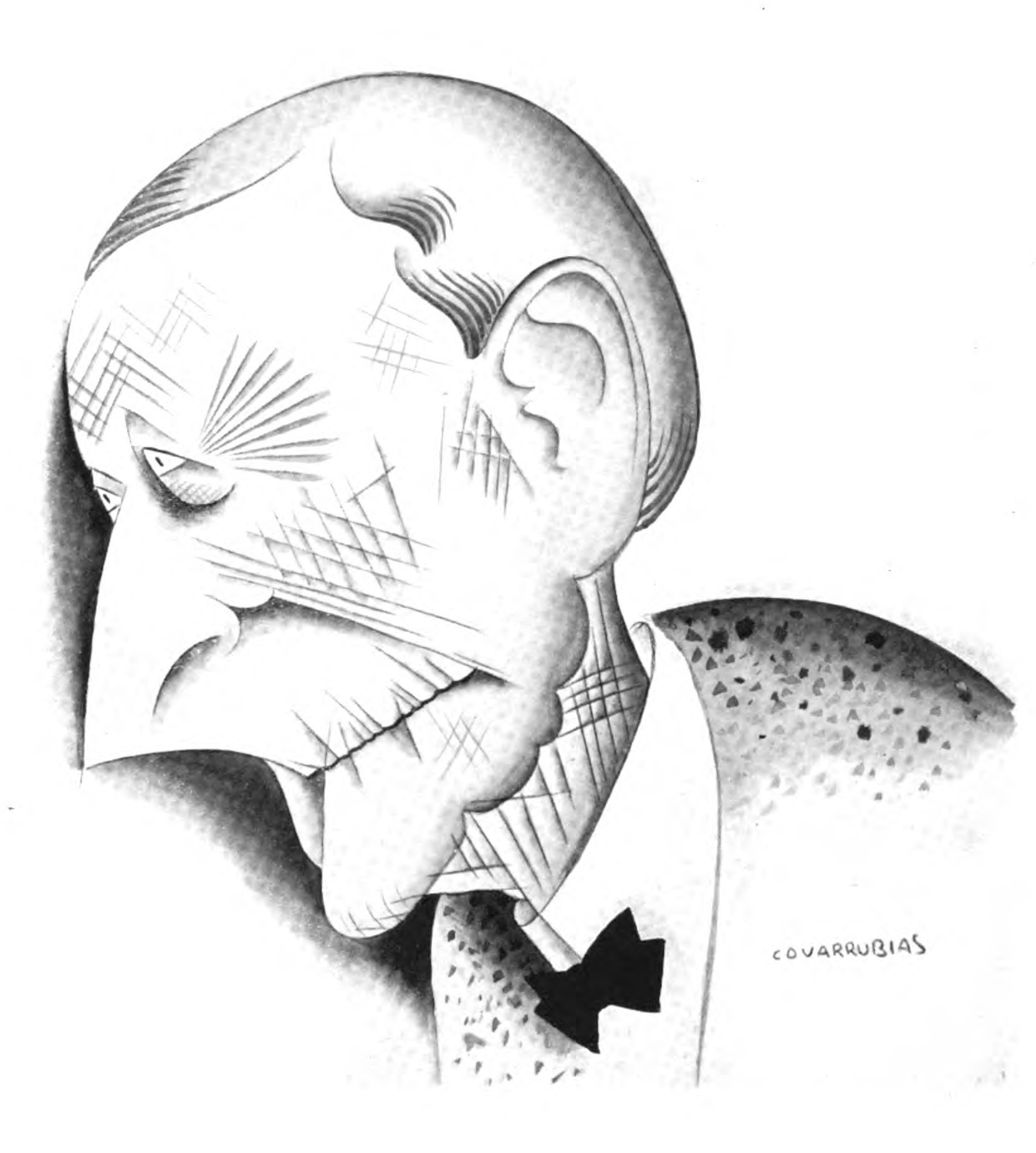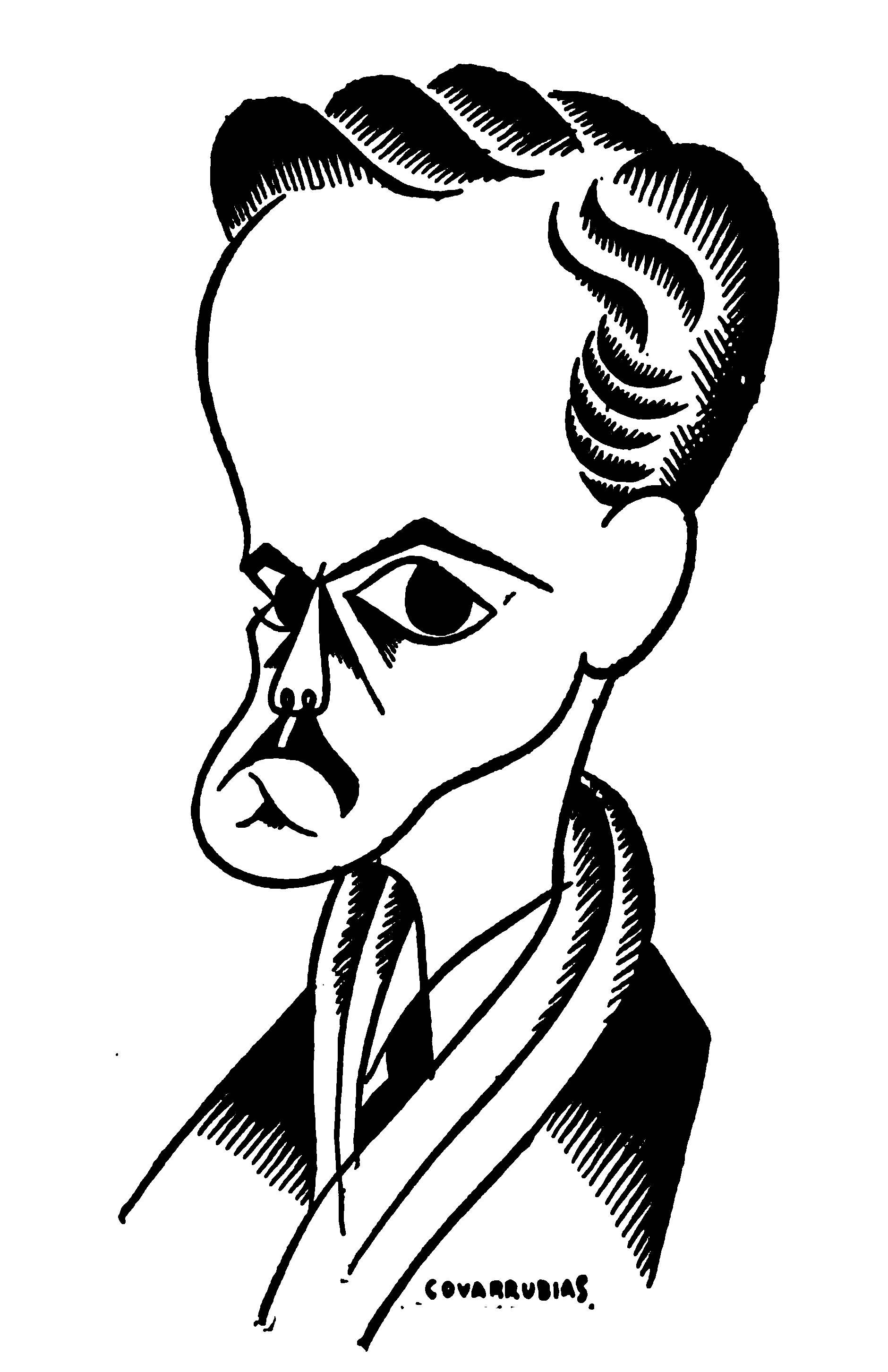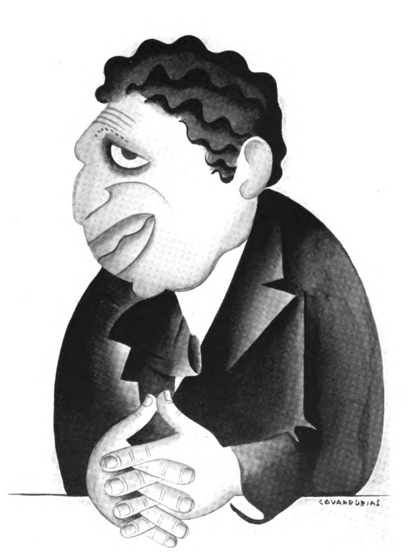I gently tugged at the portfolio that Miguel Covarrubias hugged under his arm, which, in his modesty, he had not voluntarily relinquished, and proceeded to scan the contents. Although I found myself ignorant of the very names of the subjects, with the single exception of Ramon del Valle-Inclan (and I had no idea what he looked like), I was immediately convinced that I stood in the presence of an amazing talent, if not, indeed, genius. That afternoon he made the sketches for his caricature of me, delivered two days later, the first, I think, of this New York series. That afternoon, too, I began to use the telephone in his behalf, and for the next few days I made appointments for him to meet H. L. Mencken, Waldo Frank, Avery Hopwood, Eva Le Gallienne, and a great many others. I also introduced him to Ralph Barton who, with unselfish admiration for the rare gifts of this rival caricaturist, rendered him invaluable aid and encouragement. As soon as Covarrubias had drawn a few local faces I invited him to join me one day for lunch at the Algonquin where he was acclaimed at once, held, indeed, almost a reception. From that moment he was launched—as I knew he would be: one glance at his drawings sufficed to exhibit indelible proof of his prowess.