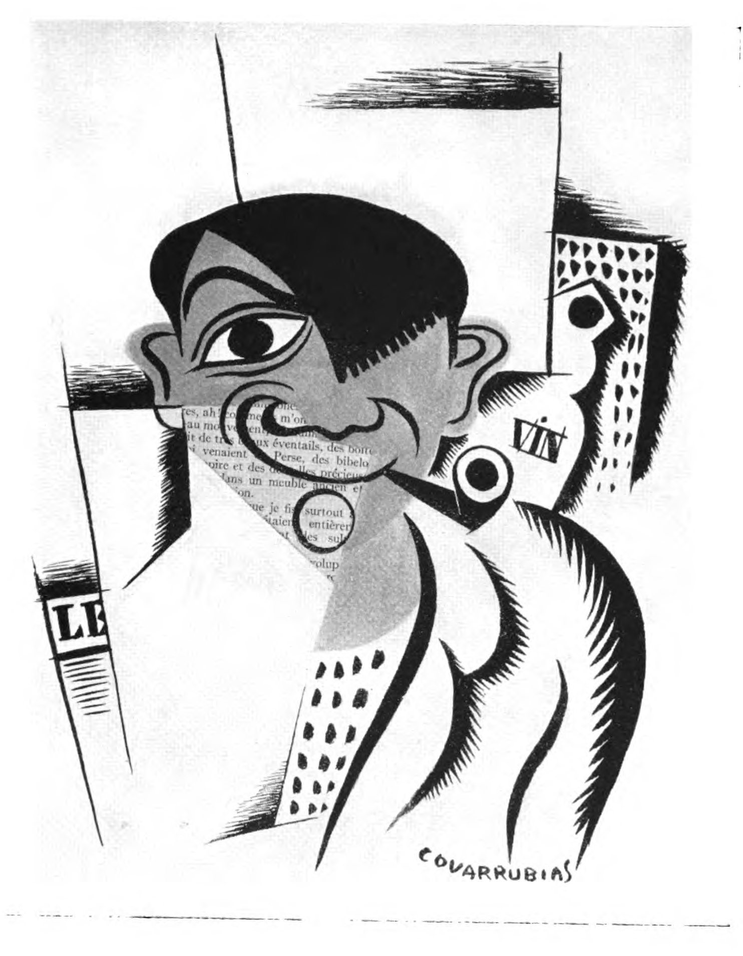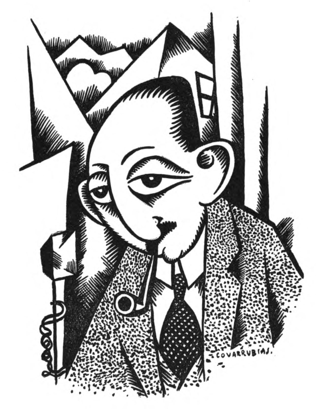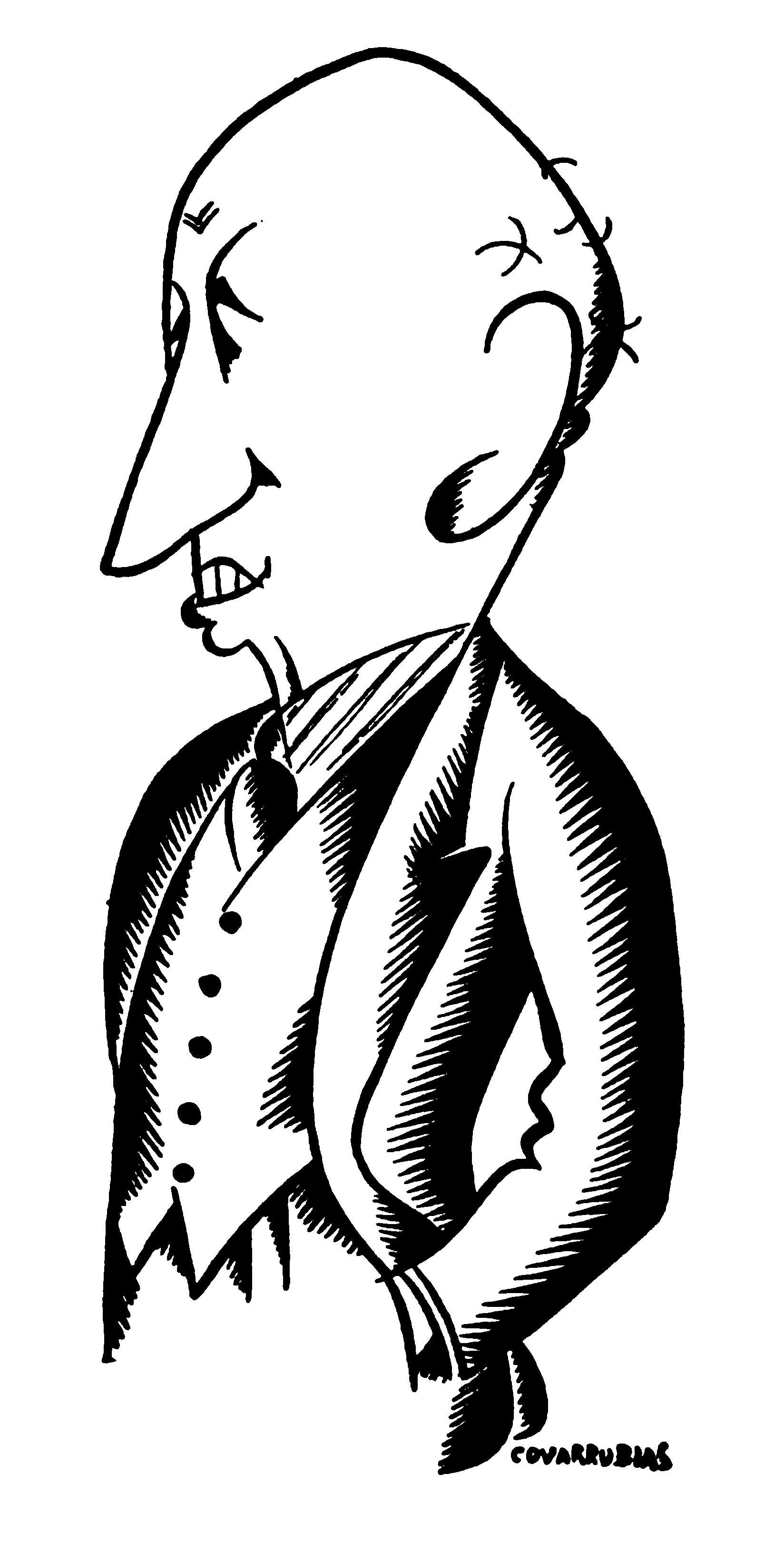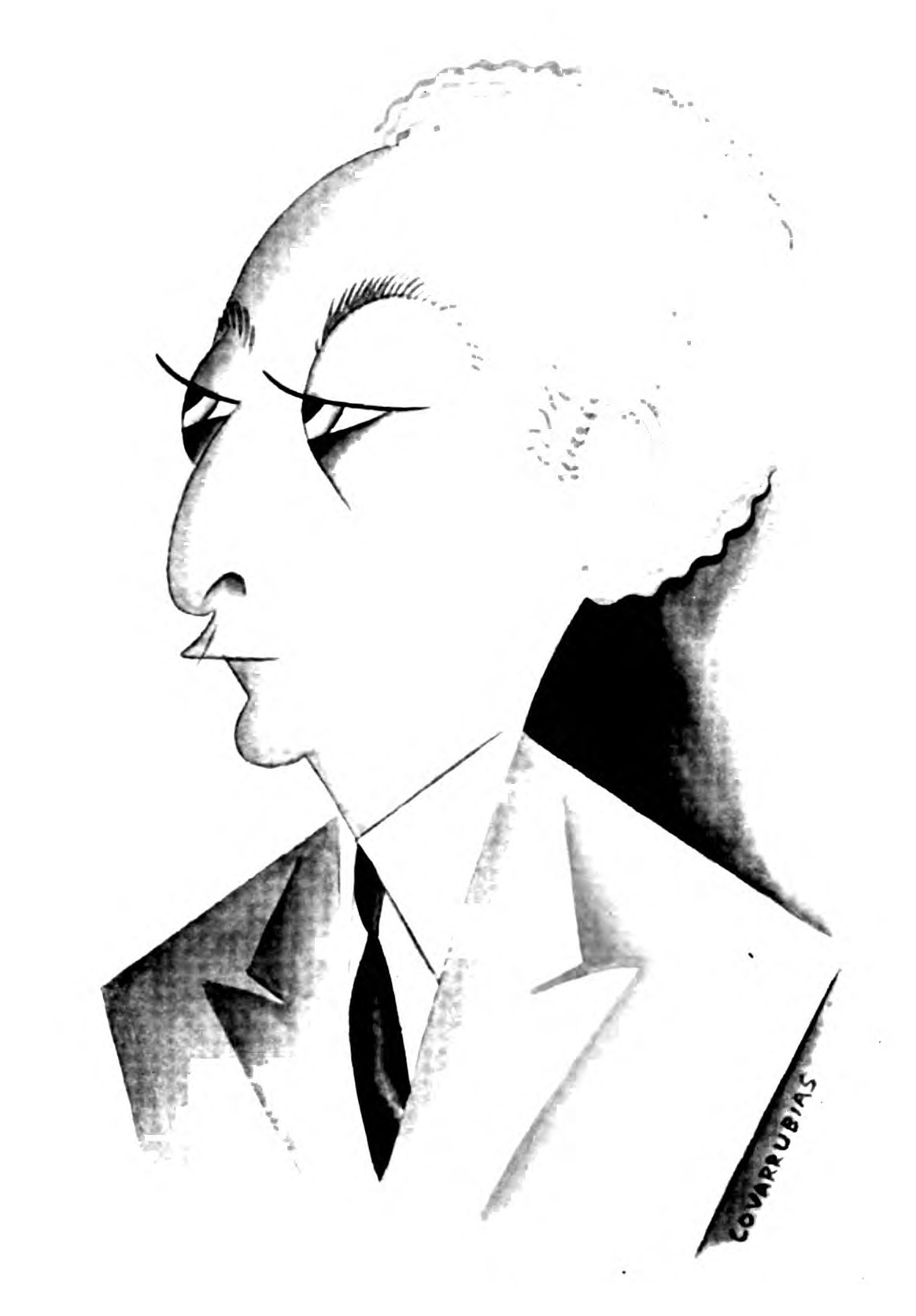 I gently tugged at the portfolio that Miguel Covarrubias hugged under his arm, which, in his modesty, he had not voluntarily relinquished, and proceeded to scan the contents. Although I found myself ignorant of the very names of the subjects, with the single exception of Ramon del Valle-Inclan (and I had no idea what he looked like), I was immediately convinced that I stood in the presence of an amazing talent, if not, indeed, genius. That afternoon he made the sketches for his caricature of me, delivered two days later, the first, I think, of this New York series. That afternoon, too, I began to use the telephone in his behalf, and for the next few days I made appointments for him to meet H. L. Mencken, Waldo Frank, Avery Hopwood, Eva Le Gallienne, and a great many others. I also introduced him to Ralph Barton who, with unselfish admiration for the rare gifts of this rival caricaturist, rendered him invaluable aid and encouragement. As soon as Covarrubias had drawn a few local faces I invited him to join me one day for lunch at the Algonquin where he was acclaimed at once, held, indeed, almost a reception. From that moment he was launched—as I knew he would be: one glance at his drawings sufficed to exhibit indelible proof of his prowess.