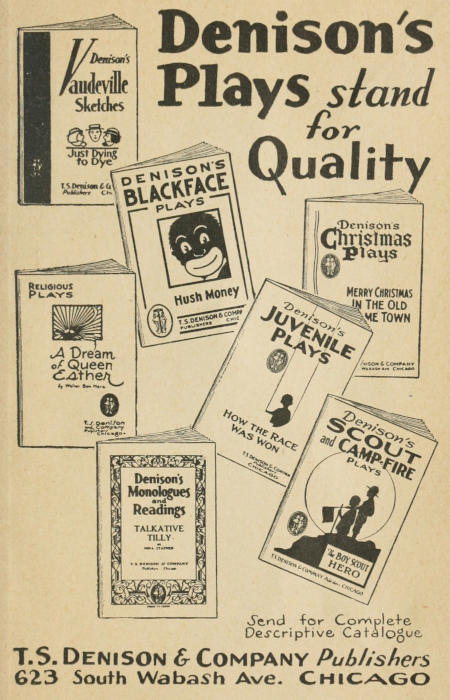 The songs in this book are to be sung to old airs that are presumably familiar to everyone. If any of them should prove unfamiliar, however, the music will be found in Denison’s “Songs Worth While,” one of the best arranged and most carefully edited collections of old favorites ever published. This book is beautifully printed on non-glossy paper, measuring 10¼ by 7 inches, and is well bound in a stout paper cover done in colors. It may be obtained from the publisher for the price of $1.00, postpaid.