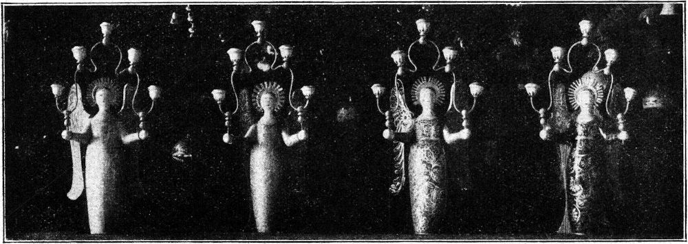 Auch an der Verwendung des Glasschmuckes erkannte man die künstlerisch fühlende Hand. Da war ein Baum nur mit bleichem Silber und mattem Gold behängt – er glitzerte wie bereift und hob nur ganz behutsam die Lößnitzer Krippe aus ihrer notwendigen Umrahmung in die Geschlossenheit des Raumes. In der einen Ecke flankierten die Weihnachtsbäume einen spätgotischen Altar aus dem Altertumsmuseum. Das edle, verblichene Gold der Holzschnitzerei durfte nicht[133] überfunkelt werden – in das Gold und Silber des Glasschmuckes sprühten nur ganz wenige blaue und rote Kugeln einige funkelnde Lichter. In der andern Ecke im kirchenhaften Licht der schmalen Fenster glitzerten die Bäume bunt um bunte Weihnachtspyramiden und über farbenfrohem Spielzeug. Aber auch da wurde das Silber, Gold, Blau, Grün, Rot der Glaskugeln mit sorgsamem Bedacht auf geschlossene Wirkung in das tiefe, weiche Grün der Bäume verteilt. Und wie nun eine solche goldene Glaskugel im vollen Lichte glitzerte, eine rote aus dem Zweigschatten glühte, wie das Bunt die Bäume überrieselte, das war nicht ohne weiteres die Schönheit des Glasschmuckes, das war die Wirkung seiner geschickten Verwendung.