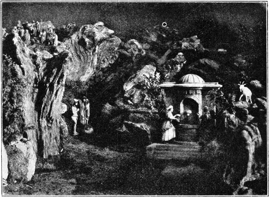 Das wird noch verstärkt durch die Einfügung der Gruppen und Einzelfiguren in die überraschend gut erfundene Landschaft, die aus phantastisch gewachsenen Wurzelhölzern und aus Moospolstern aufgebaut ist. Wer es nicht vorm Werke selbst entdeckte, findet vielleicht auf einer der photographischen Aufnahmen heraus, wie groß, wie landschaftlich echt, wie felsenhaft diese Wurzelknorren um eine Herde kleiner Schäfchen, um das Beieinander gestenreicher Figuren wirken. Diese Landschaft gibt dem Ganzen die einheitliche Szenerie, und das silbrige Grau des knorrigen Holzes, das verblichene Gelbgrün des Mooses hält die bunten Farben der Gruppen und Figuren gut zusammen. So wirkt das Ganze noch stärker als ein Werk.