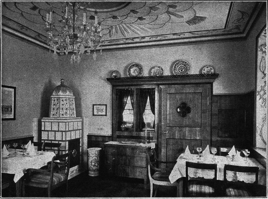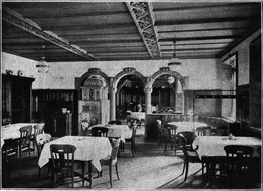 Dieses alte Dresdner Gasthaus, das an sich ein Stück Alt-Dresdner Heimat darstellt, hat nun in den letzten beiden Jahren im Innern eine neue Einrichtung und Ausstattung erhalten, die wir in ihrer Art von unserm Standpunkt aus als vorbildlich bezeichnen dürfen. Sie ist gutbürgerlich, ohne den Luxus oder den Schein von Luxus, durch den uns die vorige Generation von Architekten und Dekorateuren an so vielen Stellen, wo wir ihn weder brauchten noch suchten, den Aufenthalt verleidet hat, und doch so, daß Leute mit künstlerischen Anschauungen ihr Genüge finden und gern dort verkehren. Alles gewaltsam Humoristische, das[183] einen mit der Zeit anwidert, alles falsch verstandene Volkstümliche, alles Unechte und Talmihafte ist vermieden, der künstlerische Grundzug des Ganzen aber ist einerseits aus den geschichtlichen und sagenhaften Erinnerungen des Hauses, anderseits aus den veränderten wirtschaftlichen Bedingungen unsrer Zeit gewonnen. Die alte Grundfläche ist vollständig geblieben, modernen Verhältnissen aber entspricht, daß an Stelle der Ställe und Schuppen für Pferde- und Lastwagen zweckmäßige Autohallen getreten sind. Die Fremdenzimmer mit Raum für insgesamt hundertfünfunddreißig Betten sind einfach aber gediegen mit allem ausgestattet, was ein bürgerlicher Reisender im Gasthause, das nicht ein luxuriöser Fremdenhof sein will, erwartet. Die Gasträume sind behaglich, anheimelnd und gediegen zugleich. Was in der Ausstattung an alte Zeiten erinnert, drängt sich nicht auf, als ob ein Gasthaus ein Altertumsmuseum wäre.