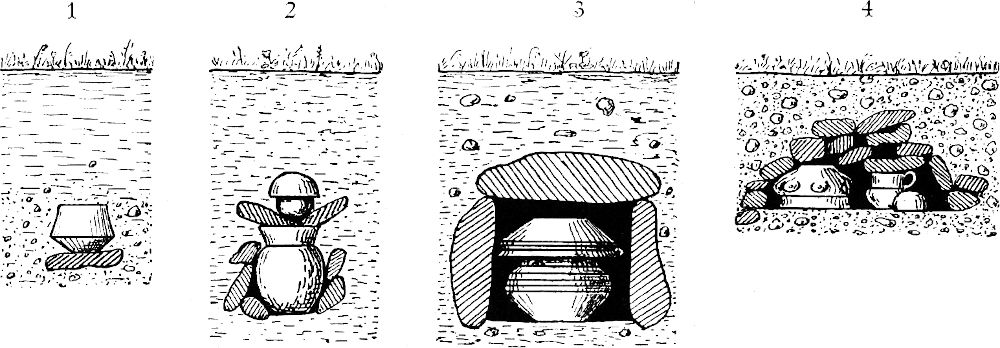 Unter den vorgeschichtlichen Funden aus dem Freistaat Sachsen nehmen die unter dem Namen »Urnenfelder« bekannten großen Gräberfelder mit Brandbestattungen einen breiten Raum ein. Ihr Auftreten bedeutet einen wichtigen Abschnitt in der Vorgeschichte des Landes. Machte sich gegen den Ausgang der Steinzeit und noch in der beginnenden Bronzezeit eine auffallende Bevölkerungsabnahme, die in den spärlichen Einzel- und Grabfunden zum Ausdruck kommt, bemerkbar, so findet man von der mittleren Bronzezeit ab überall im Flach- und vereinzelt auch im Hügellande unvermittelt in großer Zahl ausgedehnte Gräberfelder oft mit Hunderten von Einzelbestattungen, die eine in der Nähe seßhafte dichte Bevölkerung voraussetzen. Diese Bevölkerungszunahme ist nur durch Zuwanderung neuer Volksmassen in die entvölkerten Landschaften zu erklären. Mit ihrem Erscheinen fällt eine gewaltige Veränderung im Totenkult zusammen: die in der Stein- und frühesten Bronzezeit gebräuchliche Totenbestattung wird durch die Leichenverbrennung ersetzt. Die Frage, woher jene Einwanderer kamen und welches Stammes sie waren, ist bis jetzt in allseitig befriedigender Weise noch nicht beantwortet worden. Germanen, deren Vorläufer die gegen Ende der Steinzeit in Mitteldeutschland auftretenden Schnurkeramiker waren, thrakische Stämme aus der Karpathengegend, selbst Slawen sind als das Volk der Urnenfelder in Anspruch genommen worden. Die jüngste Ansicht bezeichnet als Träger der neuen Kultur illyrische Völker, die aus ihrer südeuropäischen Heimat die Leichenverbrennung mitbrachten, eine Sitte, die zwei Jahrtausende hindurch bis zur Völkerwanderungszeit in unsrer Gegend die alleinherrschende geblieben ist. Der Tote wird auf einem Holzstoß verbrannt, der Rest des Skeletts in einem Tongefäß gesammelt und mit Schmucksachen und kleineren Gefäßen, den »Tränenkrüglein« des Volksmundes, unter einem Erd- oder Steinhügel oder in einer Grube (1), oft mit Steinen umstellt und bedeckt (2 bis 4), beigesetzt. Beide Grabformen kommen in der Bronzezeit bei uns nebeneinander vor, die Hügelgräber verschwinden aber mit dem Beginn[149] der Eisenzeit, sind überhaupt seltener, vielleicht nur infolge der nivellierenden Arbeit des Pfluges, und liegen nicht in so großer Zahl beisammen wie die Flachgräber der Urnenfelder.