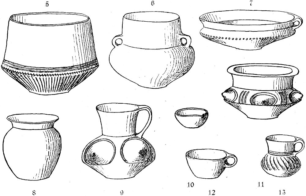 Der Charakter der älteren, der bronzezeitlichen Urnenfelder ist kein einheitlicher; sie lassen sich leicht in zwei zeitlich aufeinanderfolgende Gruppen trennen, in die der mittleren Bronzezeit, etwa 1600 bis 1200 v. Chr., und die der jüngeren, von 1200 bis 800 v. Chr. Die Unterschiede beider kommen vor allem zum Ausdruck in der reichhaltigen Keramik, die man als den »Lausitzer Typus« bezeichnet. Beiden Gruppen gemeinsam ist die kantige Profilierung der Gefäße, die scharfe Trennung von Hals und Bauch, ihre helle Farbe, grau, gelb, hellbraun und rötlich, und die Herstellungsweise aus freier Hand ohne Benutzung der Töpferscheibe. Immer wiederkehrende Formen des älteren Lausitzer Typus sind ein Napf aus zwei umgekehrt aufeinandergestellten abgestumpften Kegeln, deren[150] unterer fast stets flacher als der obere ist (5), ein eiförmiger Topf mit niedrigem, nach außen geschweiftem Hals (8), terrinenartige bauchige Gefäße ohne oder mit eingezapften oder angeklebten Henkeln (6), Krüge, deren Henkel den Oberrand nicht überragen (9, 13), breite, meist als Deckel der Urnen benutzte Henkelschüsseln (7) und kegelige oder halbkugelige Tassen und Näpfchen (10, 12). Eine für die ältere Gruppe charakteristische Form ist das Buckelgefäß in Gestalt schön profilierter Krüge (9), breiter henkelloser Näpfe mit ausladendem Rande oder bauchiger Terrinen (11) mit fast zylindrischem Hals. Ihren Namen haben diese Gefäße von den buckelartigen, der Frauenbrust nachgebildeten plastischen Verzierungen, die auf dem Oberteil des Gefäßbauches aus der Wandung herausgeformt, aufgeklebt, nicht selten eingezapft sind und von einem oder mehreren konzentrischen Höfen umgeben werden. Einfacher Art sind die Verzierungen der Gefäße: perlschnurartig aneinandergereihte Tupfen oder Einkerbungen auf vorstehenden Kanten (7, 5), Horizontalfurchen am unteren Halsrand (5, 13), Gruppen senkrechter Striche (11) oder schräge Rippen auf der Schulter (13) oder radial angeordnete Striche auf der Bauchseite (5). Große dickwandige, kesselartige, außen meist gerauhte Gefäße tragen am Halsansatz als Schmuck häufig eine aufgeklebte, kettenartig gekerbte Tonleiste.