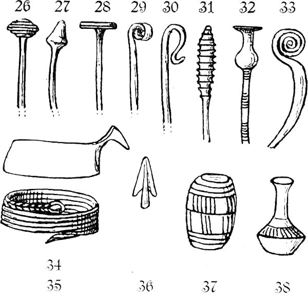 Weniger deutlich tritt der Zeitunterschied beider Gruppen in den Bronzebeigaben hervor. Geflügelte Pfeilspitzen (36), Messerklingen, zuweilen ein Angelhaken vertreten das Kleingerät des täglichen Gebrauchs; einfache oder spiralgewundene Finger- und Armringe aus glattem oder tordiertem Draht (35), flache Knöpfe mit Ösen, Röllchen aus spiraliggewundenem Draht oder Bronzeband, flache Drahtspiralen, zum Teil vielleicht Bruchstücke von Brillenfibeln (33), den Kleinschmuck. Derartige Dinge kommen in beiden Gruppen vor und haben sich aus der älteren bis in die jüngere Zeit vererbt. Sehr beliebt scheinen Schmucknadeln (26 bis 32) gewesen zu sein, die sich überall vorfinden. Solche mit quergeriefelt-linsenförmigem (26), kugeligem, kegel- (27) oder scheibenförmigem Kopf (28) oder mit breitgehämmertem, eingerolltem Ende (29) treten in den älteren wie jüngeren Bronzezeitgräbern auf, in den ersteren auch hirtenstabartig gebogene (30), in den letzteren solche mit quergeripptem, keulen- (31) oder mit vasenförmigem Kopf (32). Viereckige Rasiermesser mit Griffansatz (34) gehören zu den Beigaben der jüngeren Gruppe. Auch Edelmetall, Gold, ist den bronzezeitlichen Bewohnern unsrer Gegend nicht unbekannt gewesen, wie kleine Spiralröllchen und Armringe bezeugen. Scheiben- und erbsenförmige Perlen aus Ton oder Bernstein, tönerne Spinnwirtel und pyramidenförmige Gewichte, weiter kleine Ringe und Anhänger (Amulette?) aus flachen Steinen und flaschenförmige Tonklappern (38) in der jüngeren, ei- oder tonnenförmige (37) in der älteren Gruppe vervollständigen das Inventar der Gräber, in deren Steinsetzungen auch Getreidemühlen aus Sandstein oder Quarzporphyr zuweilen Verwendung gefunden haben.