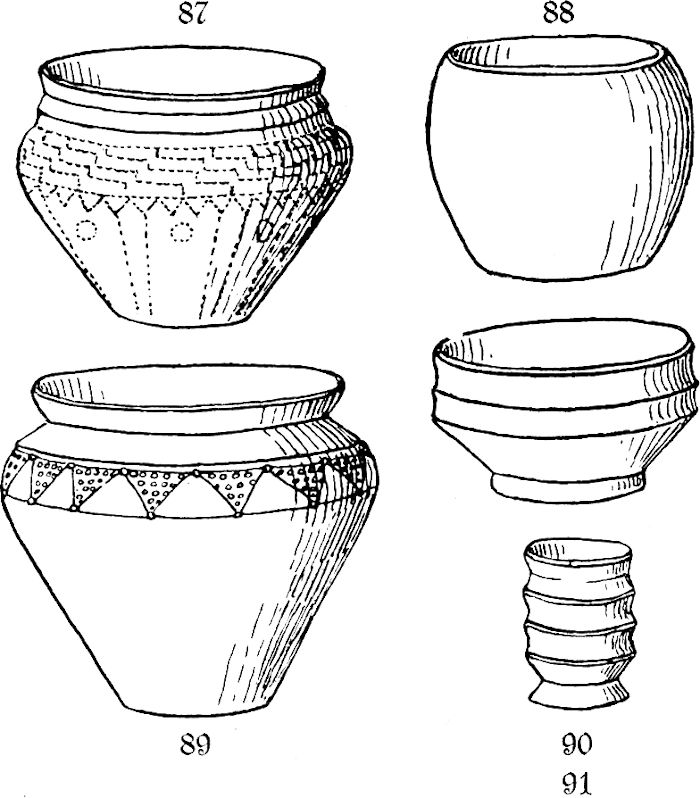 Aus der Zeit nach Christi Geburt, der römischen Kaiserzeit, sind nur noch wenige Urnenfelder bekannt; Sachsen scheint damals durch die beginnenden großen Völkerbewegungen bereits entvölkert zu sein. Aus den ersten beiden Jahrhunderten stammen zwei Brandgräberfelder in Sachsen westlich der Elbe, aus dem dritten und vierten Jahrhundert außer einzelnen Gräbern nur ein solches in der Lausitz[155] das aber eine Sonderstellung einnimmt durch die Art der Bestattung der Knochenreste wahrscheinlich in Holzgefäßen, nicht in Urnen aus Ton. Das Inventar der Gräber unterscheidet sich namentlich durch die Keramik. Die Gefäße der älteren Urnenfelder haben ausschließlich Becherform (87, 89), sind tiefschwarz, oberflächlich glänzend geglättet und reich verziert, oder rotbraun und schmucklos. Das häufigste Verzierungsmotiv ist der Mäander, meist als Treppenmäander, nach unten durch eine Reihe von Dreiecken abgeschlossen; der Gefäßbauch wird durch Doppellinien in Felder geteilt, in denen Ringe oder auch Hakenkreuze angebracht sind (87). Alle Linien werden von mehrfachen Reihen viereckiger Grübchen, die mit einem Rollrädchen eingedrückt sind, gebildet. Daneben kommen als Ornament auch Dreiecke, mit Grübchen gefüllt (89), vor. Alle Gräber enthalten nur eine Urne, keine Beigefäße, Steinsetzungen fehlen. Anders ist die Keramik der jüngeren Urnenfelder der römischen Kaiserzeit, in denen neben rohgearbeiteten Näpfen (88) Terracottagefäße römischer Arbeit (90, 91) gefunden werden.