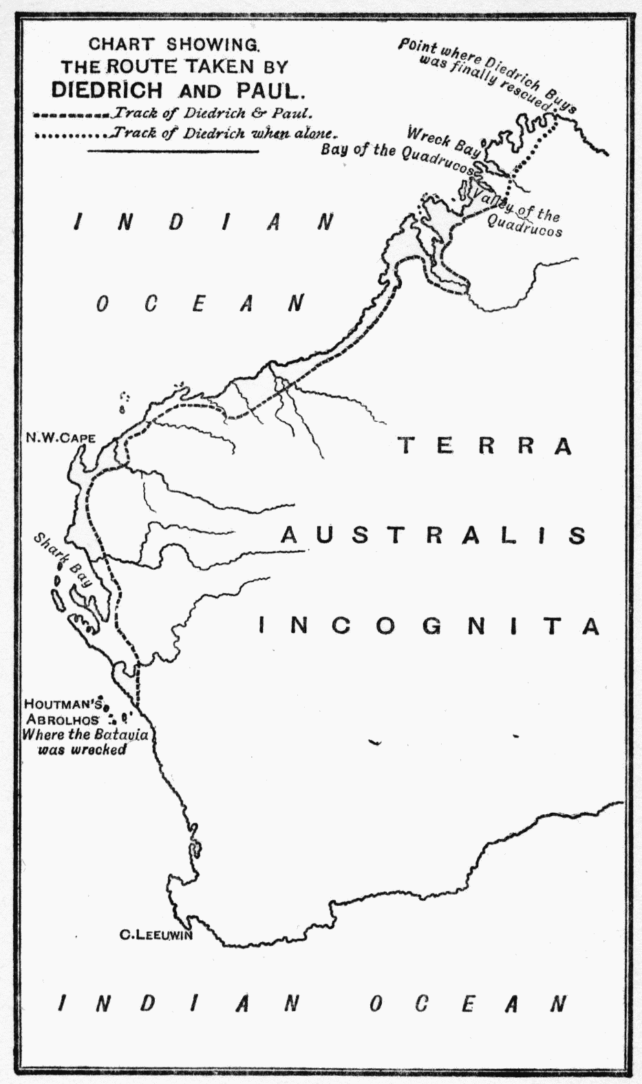 I have taken a liberty with history in introducing Captain Sharpe, the buccaneer, as in reality he never visited the Australian coast, although some of his crew did. I must also confess to having taken some freedom with chronology as, under the name of Hoogstraaten, I have introduced Abel Janz Tasman many years before{6} his actual advent on the western coast of Australia; and De Witt’s voyage of discovery really took place before the wreck of the Batavia. I trust, however, that in a romance these inaccuracies will be pardoned.