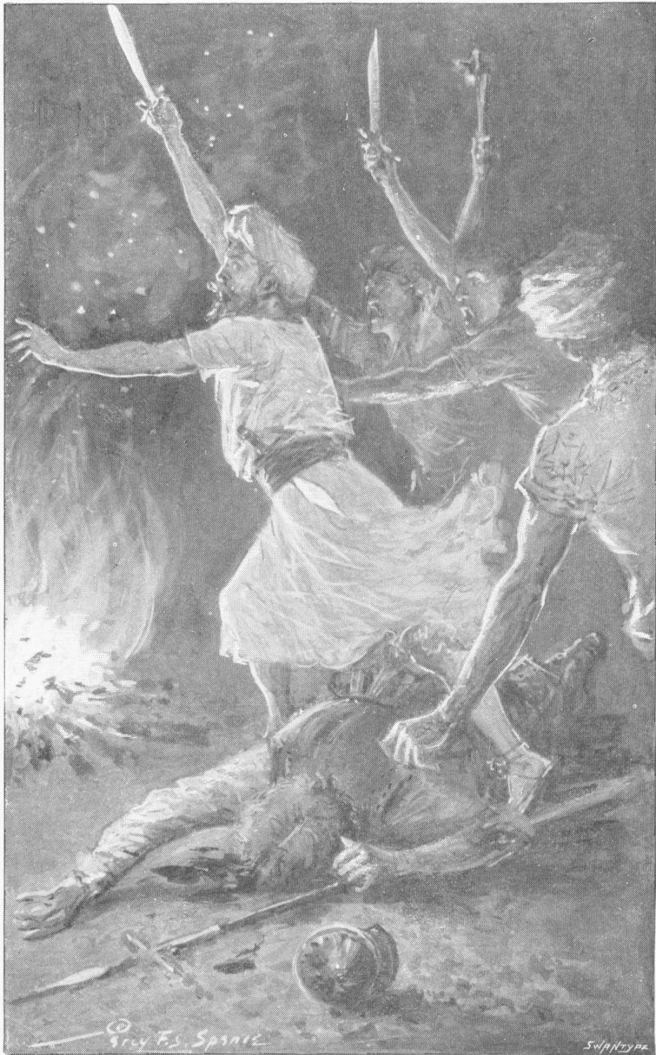As the foremost one neared the shore I went to meet it. The men lay on their oars, and stared at me with fear and amazement; and no wonder, for I must have presented a strange figure indeed, with bronzed body, flowing white hair and beard, and in my hand the rusty cutlass.