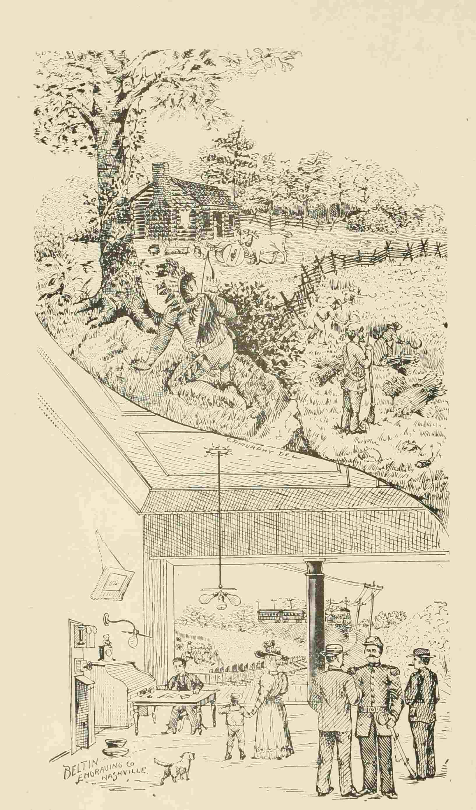 Grouped modestly in the rear of the hall were several men whose dress and accoutrements proclaimed them pioneers. There were the famous “big-foot hunter” who lived in a hollow tree (38); the man whom the Indians called the “fool warrior” on account of his reckless bravery (39); the commander of a marvellous expedition by water, of which it has been said that “it has no parallel in modern history” (40); the man for whom the oldest town in the state was named (41); the first white child born in Tennessee (42); the first white[Pg 140] child born in Nashville (43); and the bridegroom of the first marriage ceremony performed west of the Cumberland mountains (44).